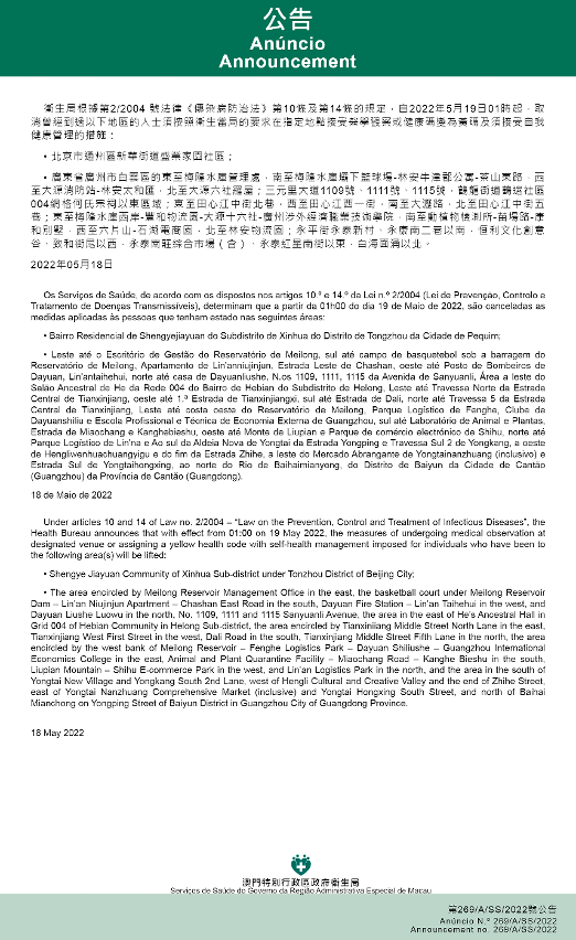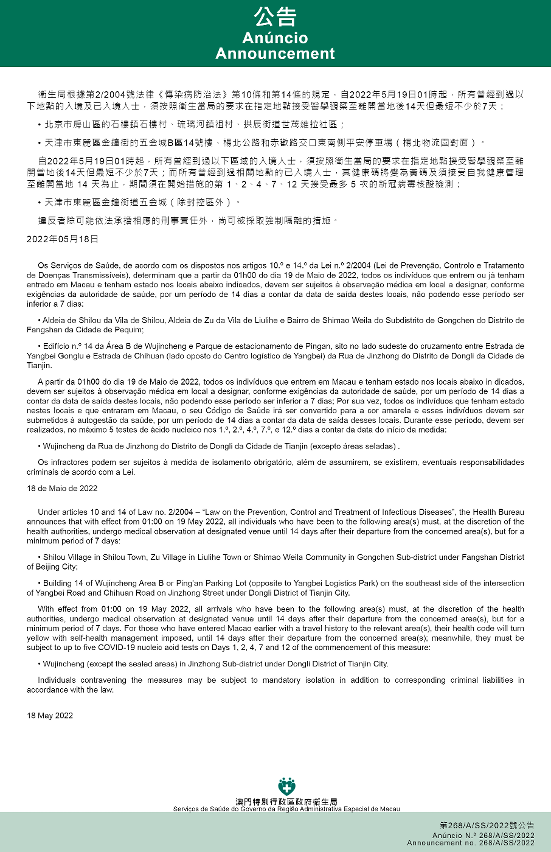 Tendo em consideração a evolução epidemiológica mais actualizada no Interior da China, os Serviços de Saúde, de acordo com os dispostos nos artigos 10.º e 14.º da Lei n.º 2/2004 (Lei de Prevenção, Controlo e Tratamento de Doenças Transmissíveis), determinam que a partir da 01h00 do dia 19 de Maio de 2022, todos os indivíduos que entrem ou já tenham entrado em Macau e tenham estado nos locais abaixo indicados, devem ser sujeitos à observação médica em local a designar, conforme exigências da autoridade de saúde, por um período de 14 dias a contar da data de saída destes locais, não podendo esse período ser inferior a 7 dias: