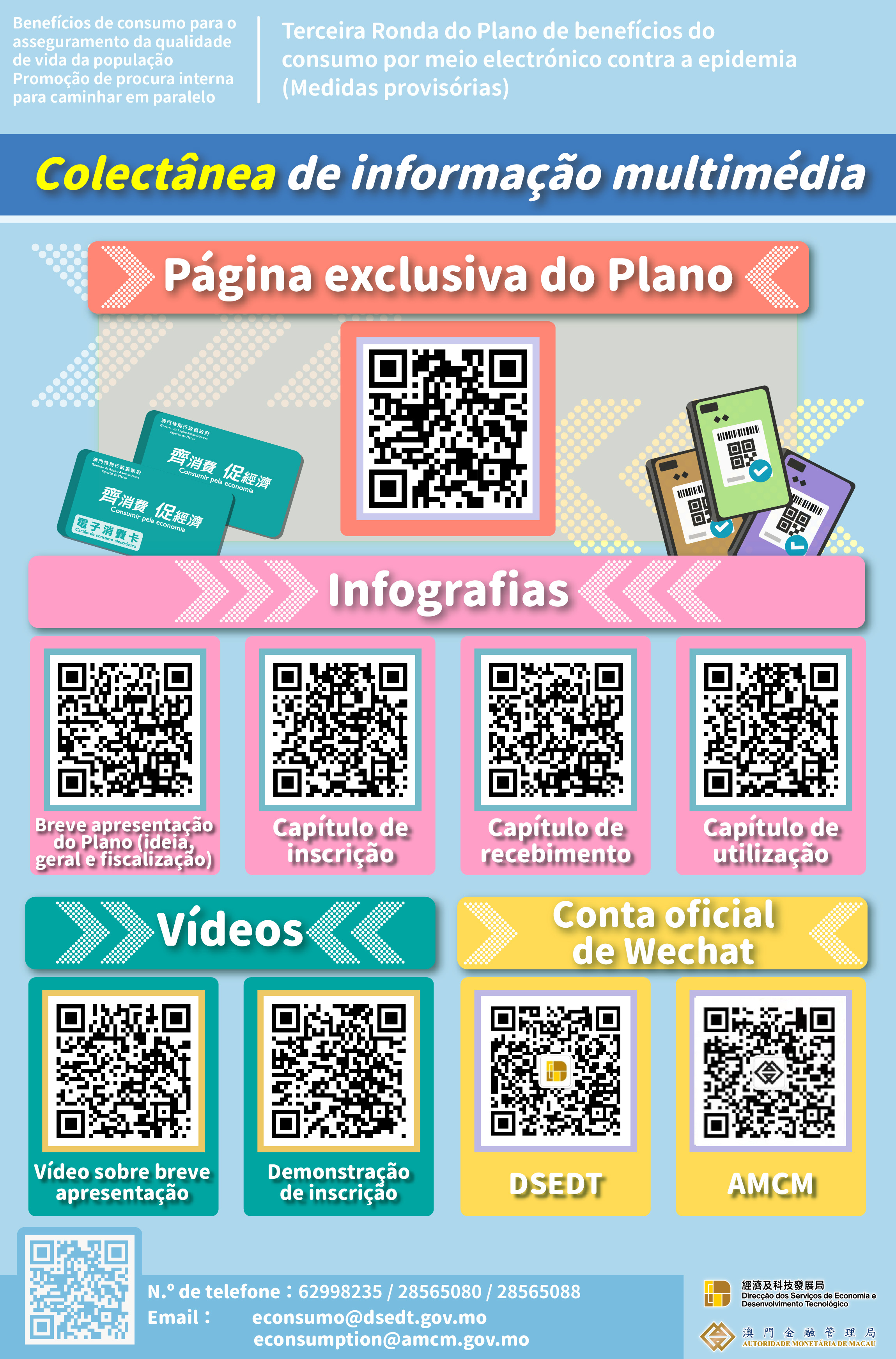 A “Terceira ronda do Plano de benefícios de consumo por meio electrónico contra a epidemia” (Plano) compreende três períodos: inscrição, recebimento e utilização, sendo as respectivas infografias e vídeos curtos actualizados e enriquecidos constantemente em conformidade com as diferentes fases, procurando proporcionar aos residentes uma “colectânea de informação promocional multimédia”, simples, fácil de entender, prática e completa.