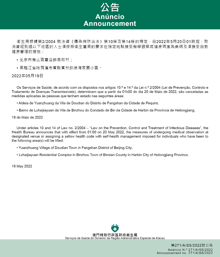 Tendo em consideração a evolução epidemiológica mais actualizada no Interior da China, o s Serviços de Saúde, de acordo com os dispostos nos artigos 10.º e 14.º da Lei n.º 2/2004 (Lei de Prevenção, Controlo e Tratamento de Doenças Transmissíveis), determinam que a partir da 01h00 do dia 20 de Maio de 2022, todos os indivíduos que entrem ou já tenham entrado em Macau e tenham estado nos locais abaixo indicados, devem ser sujeitos à observação médica em local a designar, conforme exigências da autoridade de saúde, por um período de 14 dias a contar da data de saída destes locais, não podendo esse período ser inferior a 7 dias: