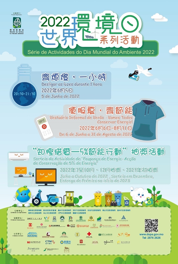 A Direcção dos Serviços de Protecção Ambiental (DSPA), aproveitando todos os anos o dia 5 de Junho, “Dia Mundial do Ambiente”, como sendo um festival internacional com iniciativas de protecção ambiental, continua a organizar a “Série de Actividades do Dia Mundial do Ambiente 2022”, conjuntamente com os serviços ambientais da Grande Baía Guangdong-Hong Kong-Macau e com vários departamentos públicos de Macau, associações, complexos de entretenimento e hotéis e instituições, apelando aos cidadãos para darem resposta à conservação energética e à redução de emissões. As actividades abrangem a de “Desligar as luzes durante 1 hora”, o “Vestuário Informal de Verão, vamos todos conservar energia!” e o sorteio da Actividade de “Poupança de Energia – Acção de Conservação de 5% de Energia”.
