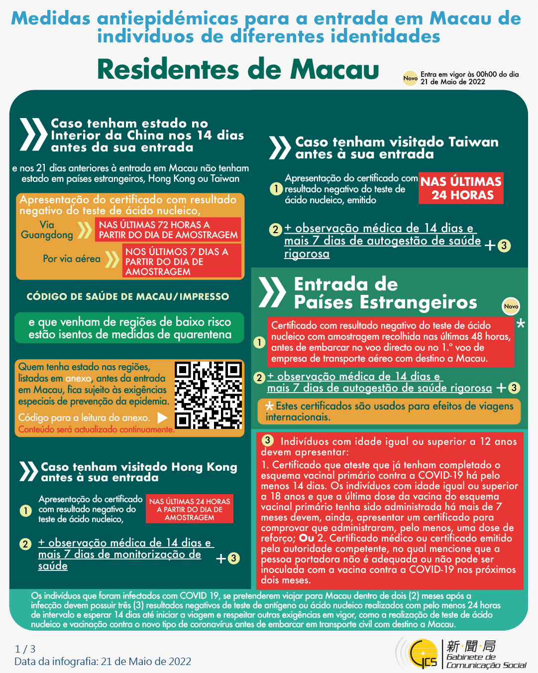 (Infografia)Medidas antiepidémicas para a entrada em Macau de indivíduos de diferentes identidades, actualizadas no dia 21 de Maio de 2022
