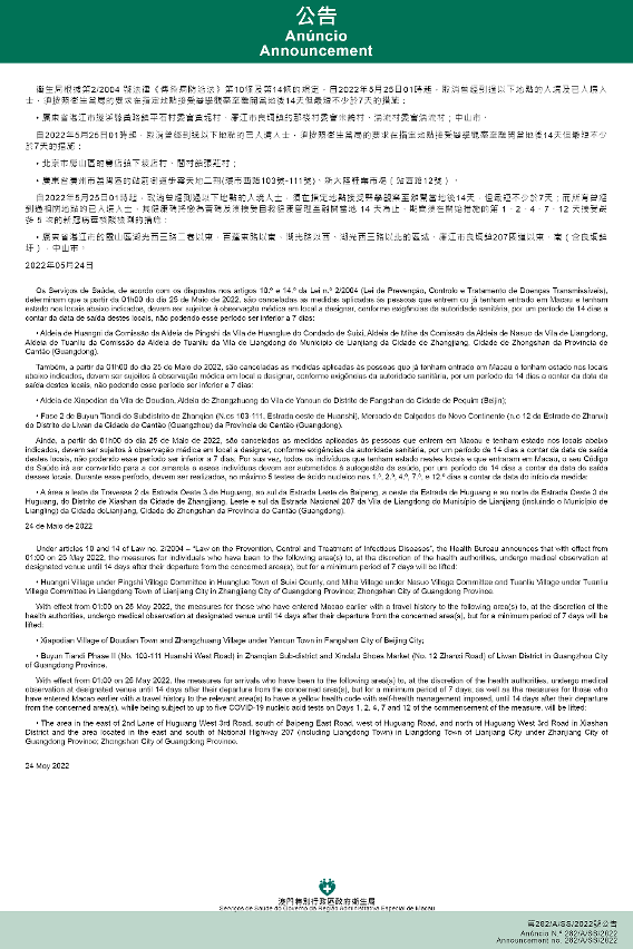 Também se anuncia, ainda, que a partir da 01h00 do dia 25 de Maio de 2022, são canceladas as medidas aplicadas às pessoas que já tenham entrado em Macau e tenham estado nos locais abaixo indicados, devem ser sujeitos à observação médica em local a designar, conforme exigências da autoridade sanitária, por um período de 14 dias a contar da data de saída destes locais, não podendo esse período ser inferior a 7 dias: