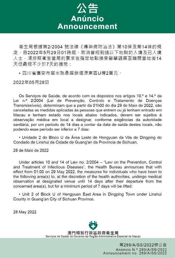 Tendo em consideração a evolução epidemiológica mais actualizada no Interior da China, os Serviços de Saúde, de acordo com os dispostos nos artigos 10.º e 14.º da Lei n.º 2/2004 (Lei de Prevenção, Controlo e Tratamento de Doenças Transmissíveis), determinam que a partir da 01h00 do dia 29 de Maio de 2022, são canceladas as medidas aplicadas às pessoas que entrem ou já tenham entrado em Macau e tenham estado nos locais abaixo indicados, devem ser sujeitos à observação médica em local a designar, conforme exigências da autoridade sanitária, por um período de 14 dias a contar da data de saída destes locais, não podendo esse período ser inferior a 7 dias: