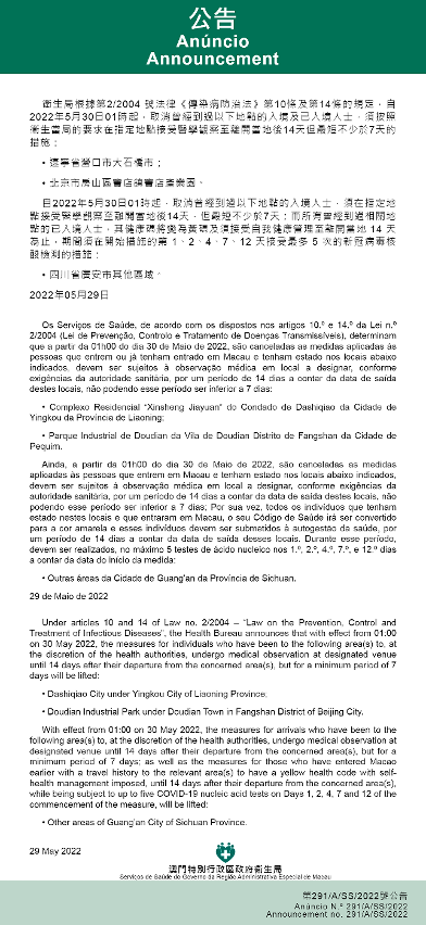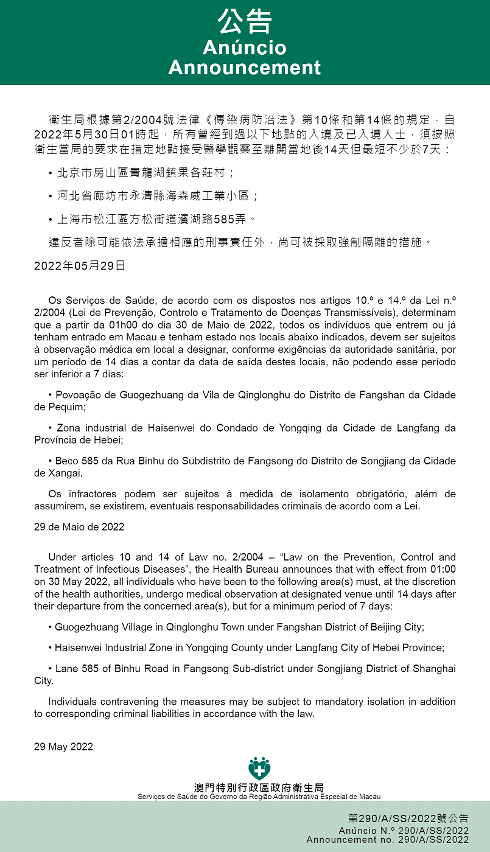 Tendo em consideração a evolução epidemiológica mais actualizada no Interior da China, os Serviços de Saúde, de acordo com os dispostos nos artigos 10.º e 14.º da Lei n.º 2/2004 (Lei de Prevenção, Controlo e Tratamento de Doenças Transmissíveis), determinam que a partir da 01h00 do dia 30 de Maio de 2022, todos os indivíduos que entrem ou já tenham entrado em Macau e tenham estado nos locais abaixo indicados, devem ser sujeitos à observação médica em local a designar, conforme exigências da autoridade de saúde, por um período de 14 dias a contar da data de saída destes locais, não podendo esse período ser inferior a 7 dias: