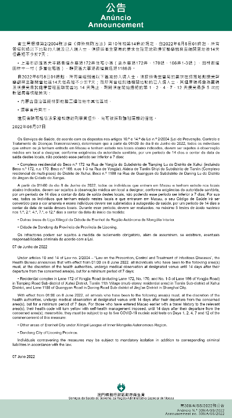 Tendo em consideração a evolução epidemiológica mais actualizada no Interior da China, os Serviços de Saúde, de acordo com os dispostos nos artigos 10.º e 14.º da Lei n.º 2/2004 (Lei de Prevenção, Controlo e Tratamento de Doenças Transmissíveis), determinam que a partir da 01h00 do dia 8 de Junho de 2022, todos os indivíduos que entrem ou já tenham entrado em Macau e tenham estado nos locais abaixo indicados, devem ser sujeitos à observação médica em local a designar, conforme exigências da autoridade sanitária, por um período de 14 dias a contar da data de saída destes locais, não podendo esse período ser inferior a 7 dias: