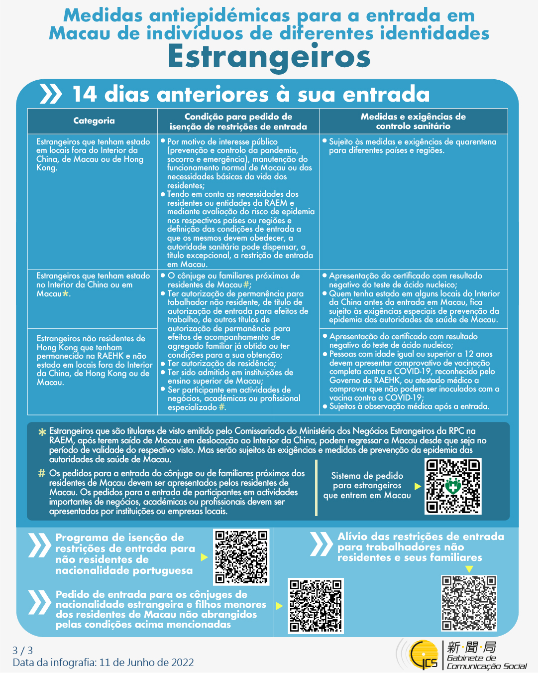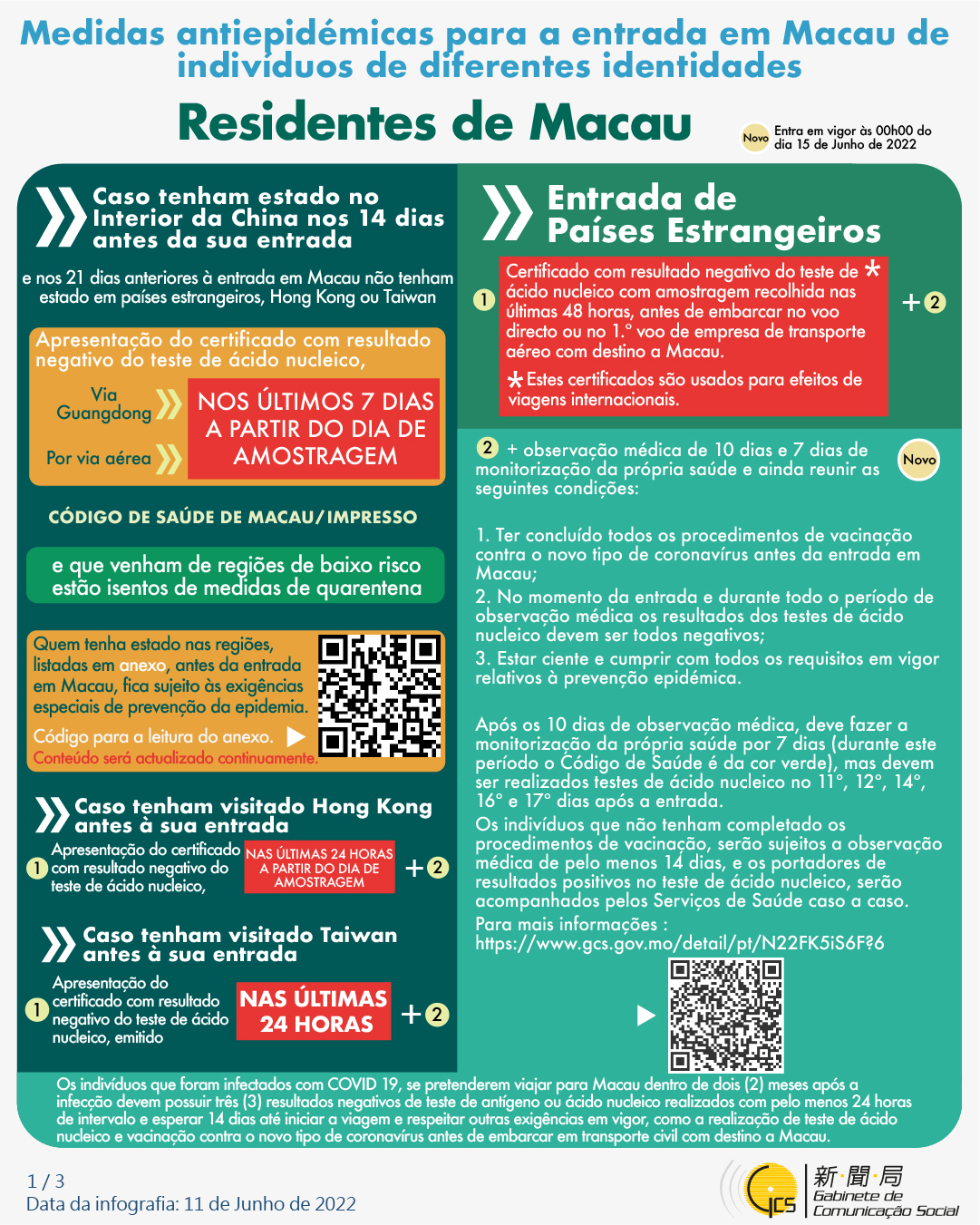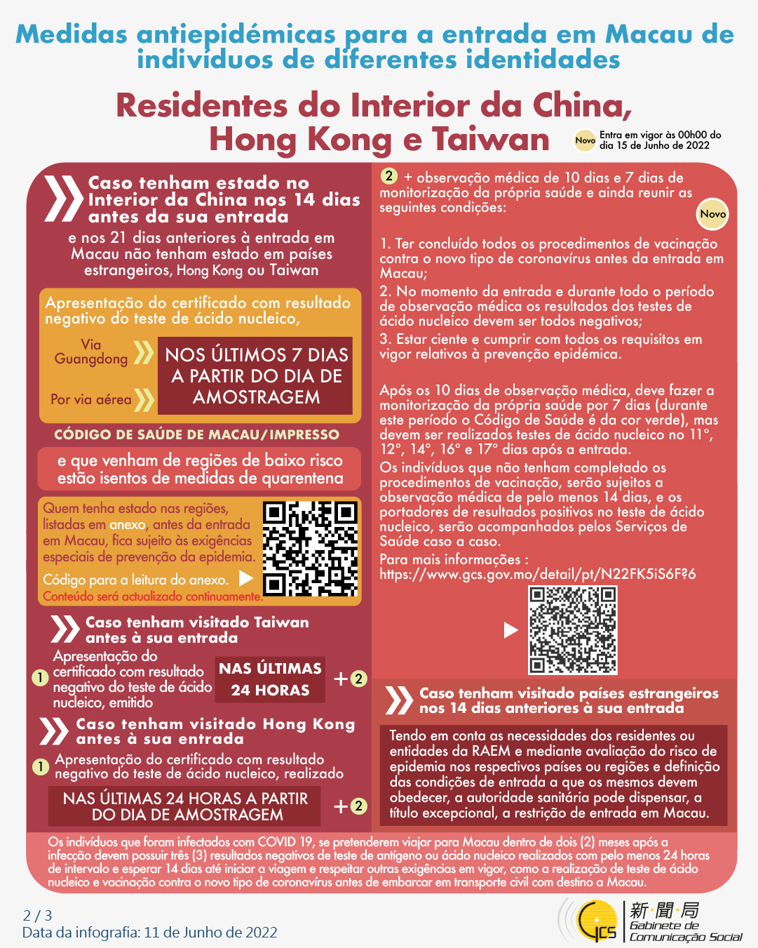 (Infografia)Medidas antiepidémicas para a entrada em Macau de indivíduos de diferentes identidades, actualizadas no dia 11 de Junho de 2022