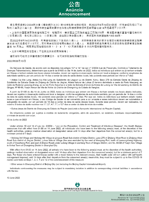 Tendo em consideração a evolução epidemiológica mais actualizada no Interior da China, os Serviços de Saúde, de acordo com os dispostos nos artigos 10.º e 14.º da Lei n.º 2/2004 (Lei de Prevenção, Controlo e Tratamento de Doenças Transmissíveis), determinam que a partir da 01h00 do dia 14 de Junho de 2022, todos os indivíduos que entrem ou já tenham entrado em Macau e tenham estado nos locais abaixo indicados, devem ser sujeitos à observação médica em local a designar, conforme exigências da autoridade sanitária, por um período de 14 dias a contar da data de saída destes locais, não podendo esse período ser inferior a 7 dias: