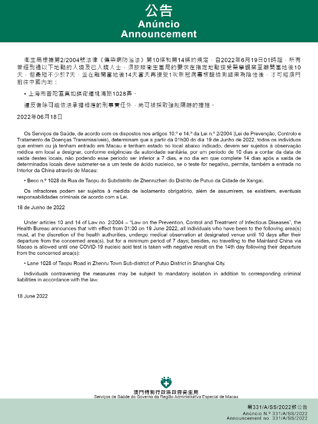 Tendo em consideração a evolução epidemiológica mais actualizada no Interior da China, os Serviços de Saúde, os Serviços de Saúde, de acordo com os dispostos nos artigos 10.º e 14.º da Lei n.º 2/2004 (Lei de Prevenção, Controlo e Tratamento de Doenças Transmissíveis), determinam que a partir da 01h00 do dia 19 de Junho de 2022, todos os indivíduos que entrem ou já tenham entrado em Macau e tenham estado no local abaixo indicado, devem ser sujeitos à observação médica em local a designar, conforme exigências da autoridade sanitária, por um período de 10 dias a contar da data de saída destes locais, não podendo esse período ser inferior a 7 dias, e no dia em que complete 14 dias após a saída de determinados locais deve submeter-se a um teste de ácido nucleico, se o teste for negativo, permite, também a entrada no Interior da China através de Macau: