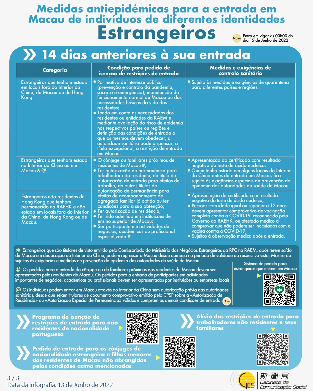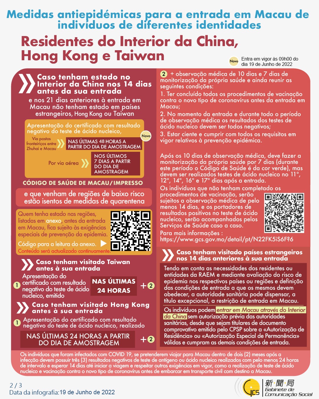 (Infografia)Medidas antiepidémicas para a entrada em Macau de indivíduos de diferentes identidades, actualizadas no dia 19 de Junho de 2022