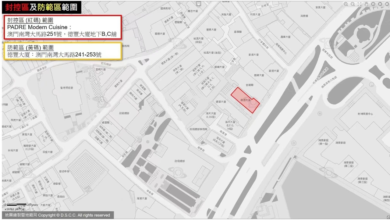 Nas zonas do Edifício. YIM LAI (Rua de Manuel de Arriaga n.º 60-66C) e do restaurante PADRE Modern Cuisine (sito na Avenida da Praia Grande, n.º 251, EDF. TAK FUNG, R/C B e C) foram implementadas as medidas de gestão e controlo para a conversão do Código de Saúde na cor vermelha e realização de testes de ácido nucleico no local, com intervalos de 1, 2, 3, 5 e 7 dias.