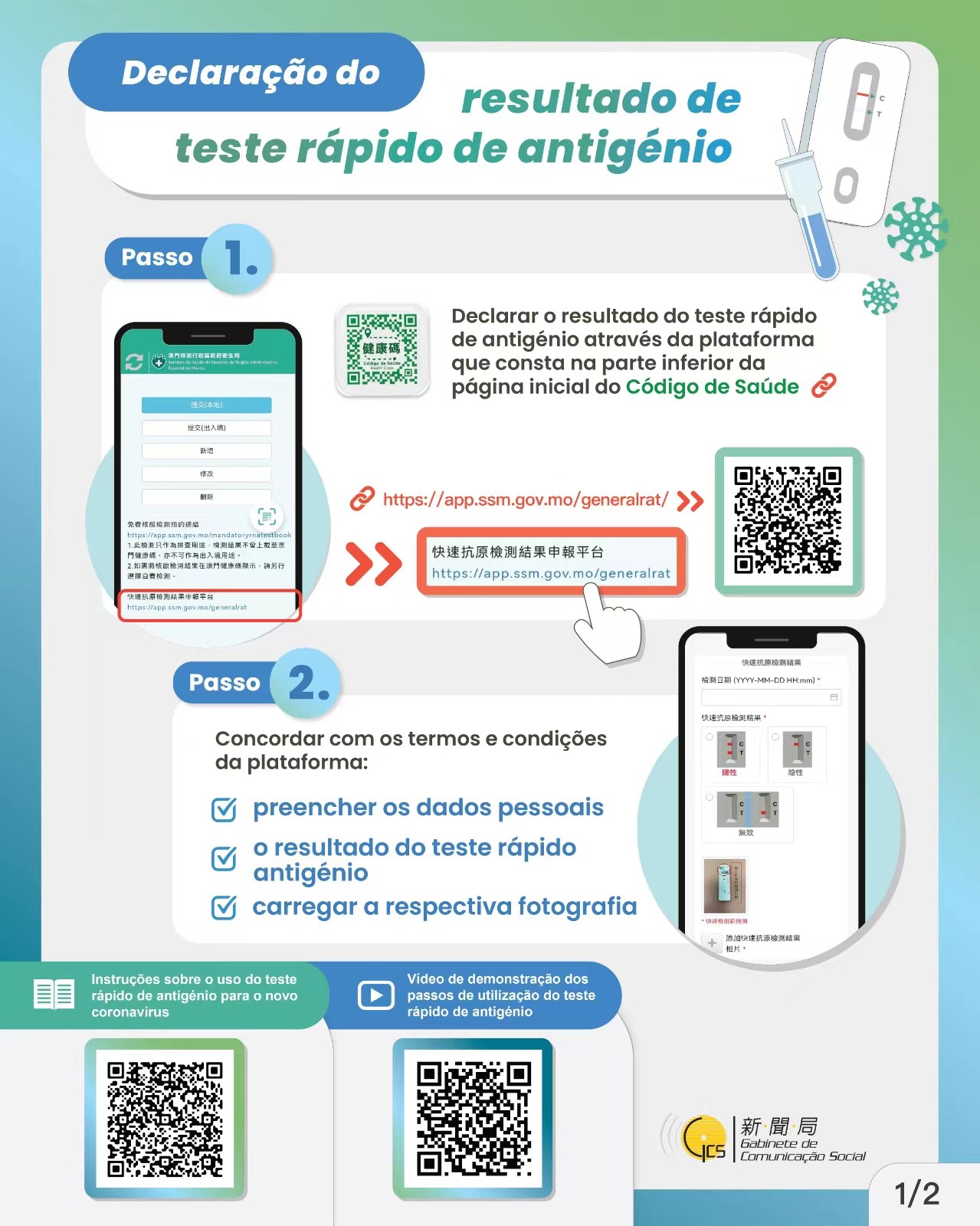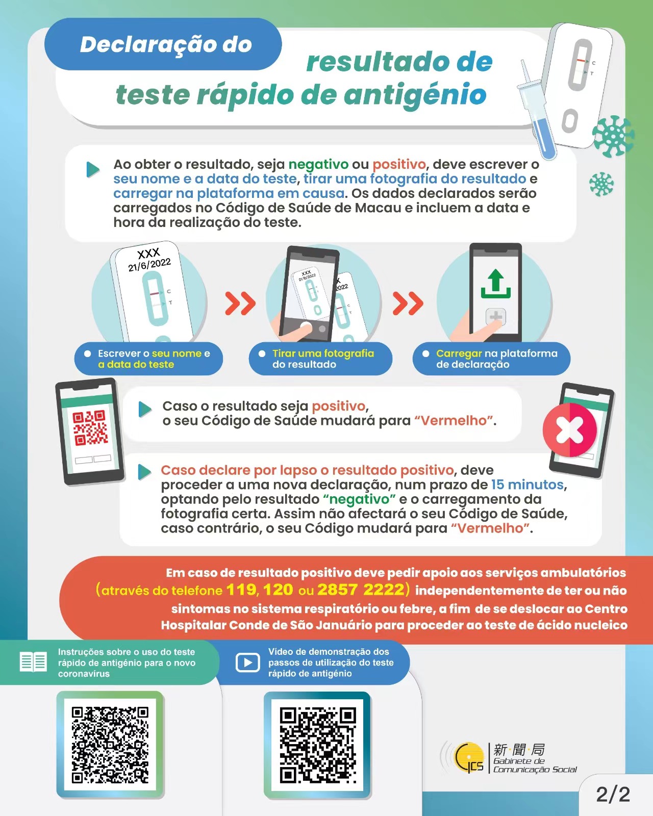 Para mais informações sobre o auto-teste de antigénio pode aceder à página exclusiva do auto-teste de antigénio: https://www.ssm.gov.mo/apps1/covidagtest/ch.aspx#clg21988。