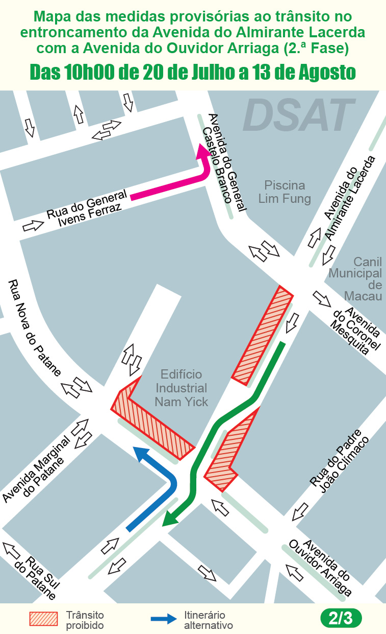 A 2.a fase realizar-se-á entre 20 de Julho a 13 de Agosto, com início às 10h do primeiro dia. No troço da Avenida do Ouvidor Arriaga junto do Edifício Industrial Nam Yick manter-se-á a probição do trânsito e na Rua do General Ivens Ferraz também manter-se-á a circulação em sentido único. O troço da Avenida do Almirante Lacerda junto do Avenida do Ouvidor Arriaga ficará vedado ao trânsito, enquanto o troço da Avenida do Ouvidor Arriaga (do lado do Edifício Luis Gonzaga Gomes) entre a Avenida do Almirante Lacerda e a Rua do Padre João Clímaco passará a ser estrada sem saída.