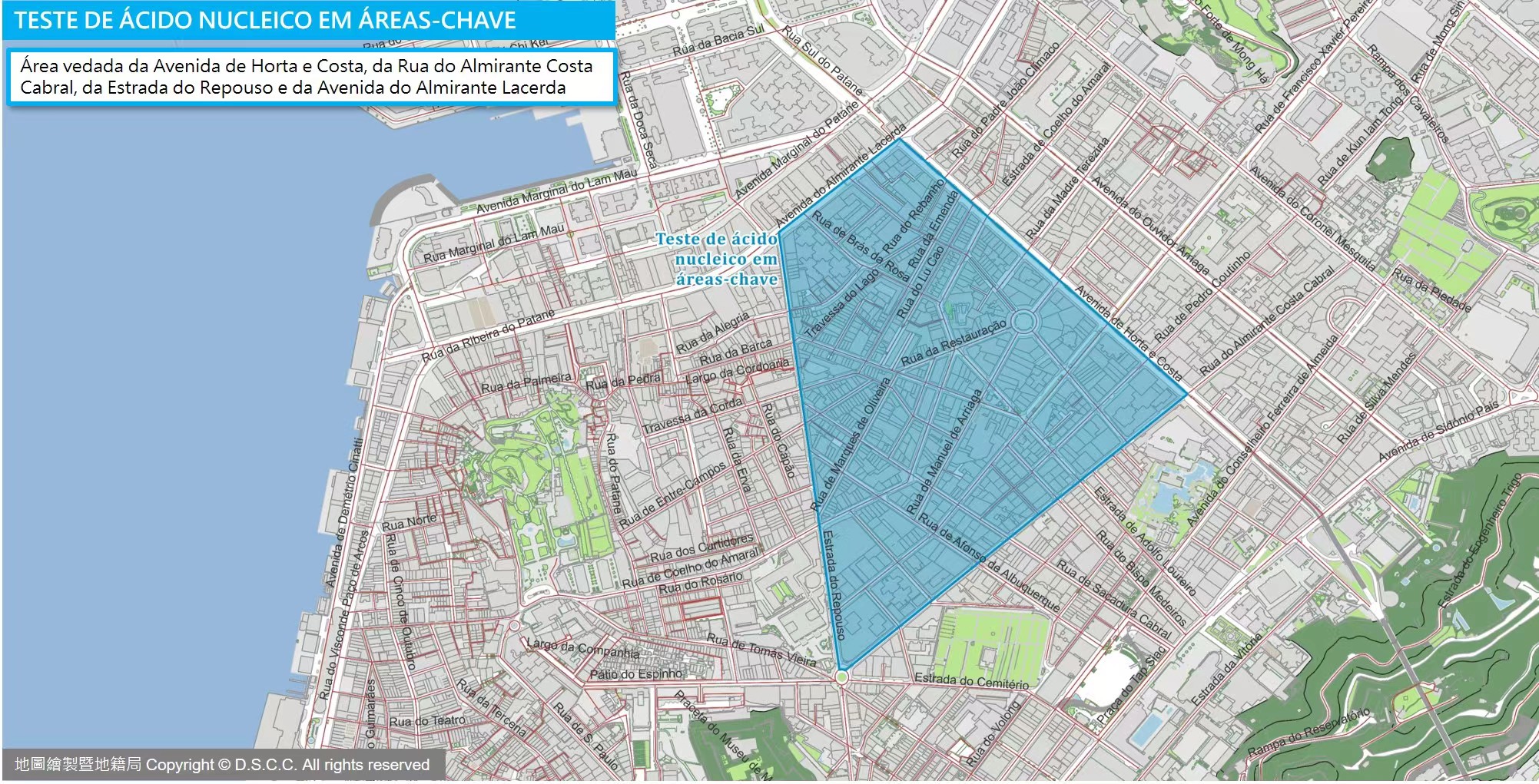 - Os destinatários sujeitos aos Testes da Zona Alvo incluem: Indivíduos que morem, trabalhem ou tenham actividades na zona delimitada pela Avenida de Horta e Costa, Rua do Almirante Costa Cabral, Estrada do Repouso, Avenida do Almirante Lacerda, ou seja, indivíduos que tenham estado nos locais acima referidos por um período total superior a uma hora no dia 16 de Junho ou após essa data.