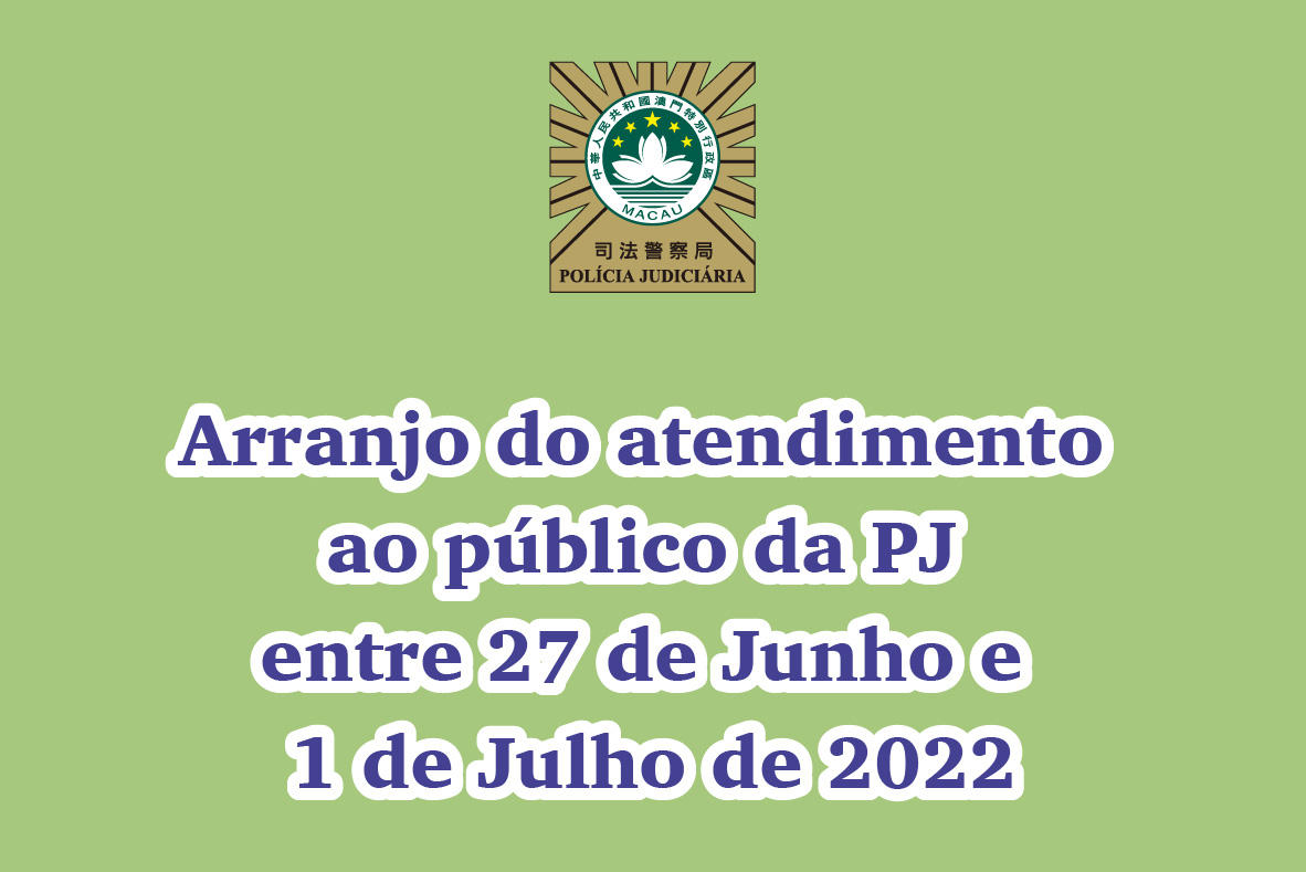 Entre 27 de Junho e 1 de Julho , o Núcleo de Denúncias e Intervenção da PJ continua prestar serviço ininterrupto, e a Sala de Apresentação Periódica mantem o funcionamento normal. São canceladas a prestação de declarações na investigação e os teste de paternidade marcadas no referido período posteriomente serão informadas as novas dates. Para mais esclarecimento, favor telefonar para o número 88001326.