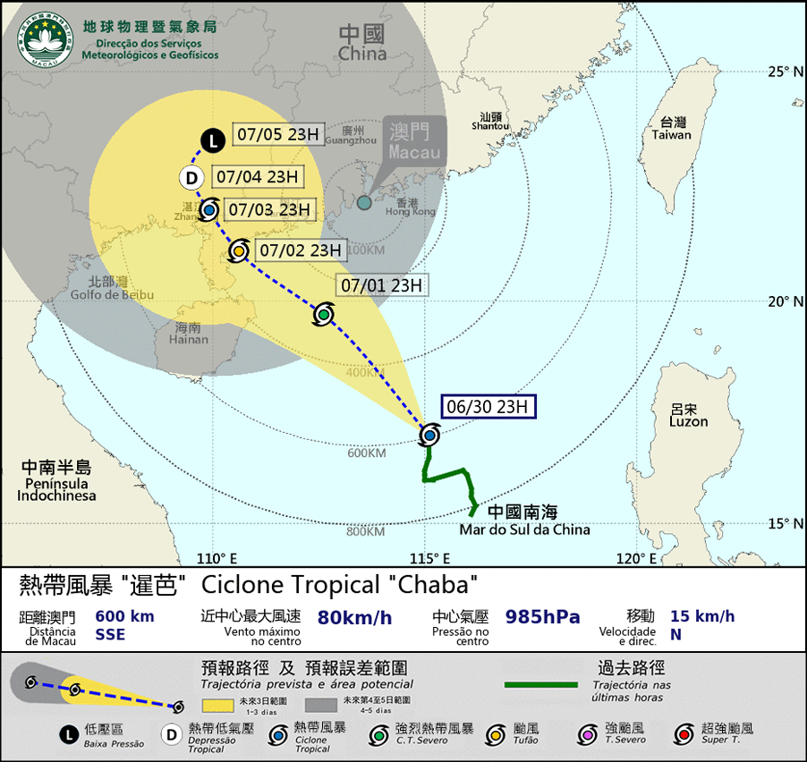 O ciclone tropical “Chaba” está a deslocar-se, lentamente, para Noroeste, em direcção às regiões entre a costa oeste de Guangdong e da Ilha de Hainan. A probabilidade de emissão do sinal n.o 3 na madrugada do dia 1, é relativamente alta. Além disso, existem variáveis na trajectória e intensidade do “Chaba”, isto, devido à influência e desenvolvimento de outra área de baixa pressão a leste das Filipinas. Se o ciclone tropical “Chaba” adoptar uma trajectória mais para norte e mais próximo de Macau ou se intensificar perto da costa, não será descartada a hipótese de emitir um sinal de tempestade tropical mais elevado.