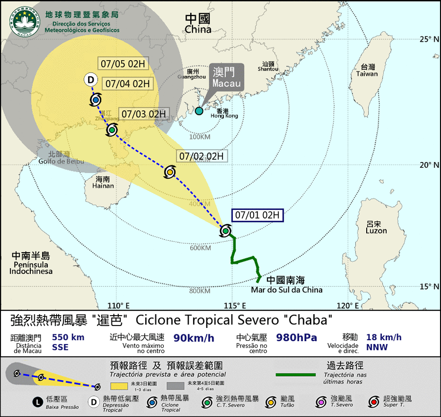 O ciclone tropical “Chaba”, intensificou-se para um ciclone tropical severo. “Chaba” está a deslocar-se para Noroeste, em direcção às regiões entre a costa oeste de Guangdong e da Ilha de Hainan. Além disso, existem variáveis na trajectória e intensidade do “Chaba”, isto, devido à influência e desenvolvimento de outra área de baixa pressão a leste das Filipinas. Se o ciclone tropical “Chaba” adoptar uma trajectória mais para norte e mais próximo de Macau ou se intensificar perto da costa, não será descartada a hipótese de emitir um sinal de tempestade tropical mais elevado.