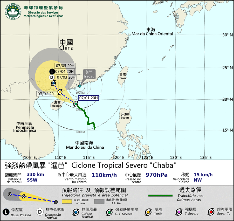 O ciclone tropical severo “Chaba” está a mover-se para Noroeste, geralmente em direcção a costa oeste de Guangdong e vai cruzar o ponto mais próximo de Macau, entre a noite do dia 1 e a madrugada do dia 2. O ciclone tropical severo "Chaba" vai intensificar para um tufão. Consequentemente, esta Direcção vai emitir o sinal n.o 8 às 21:30 horas.