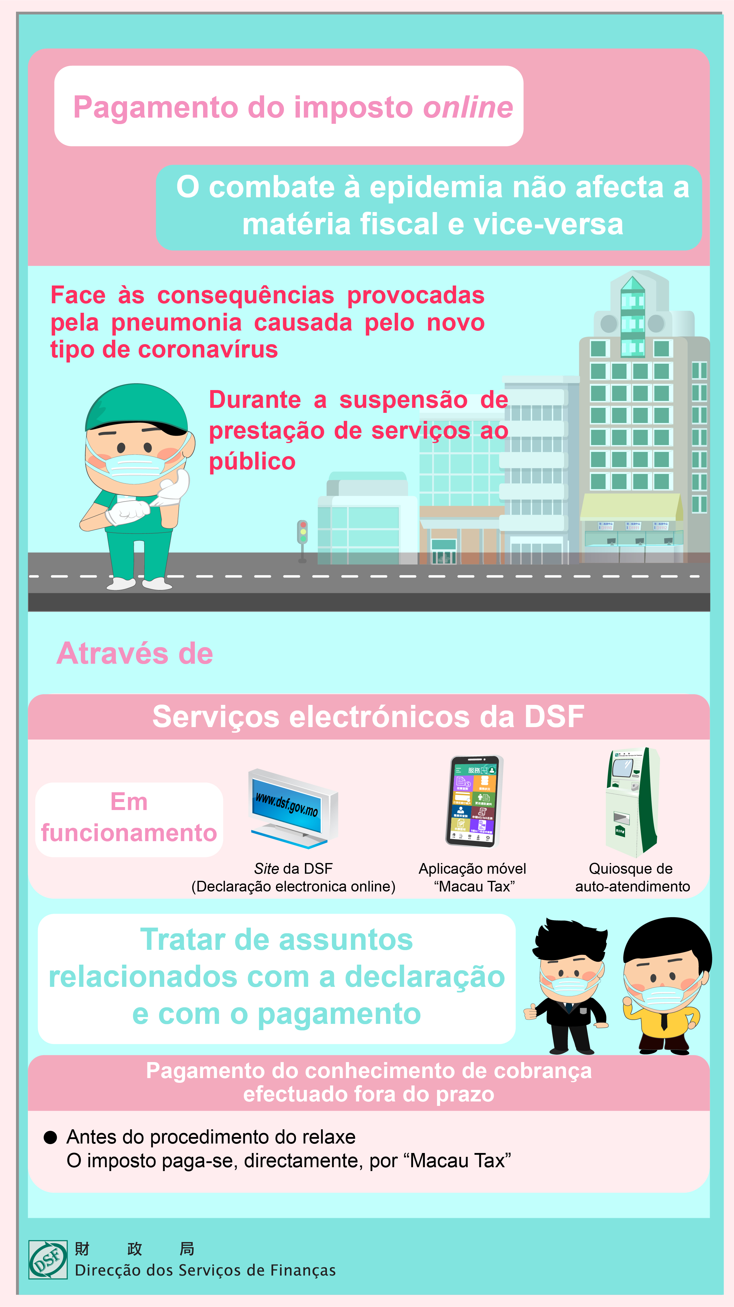 Face às consequências provocadas pela pneumonia causada pelo novo tipo de coronavírus e atendendo às necessidades de prevenção da epidemia, o Edifício “Finanças”, sito na Avenida da Praia Grande, bem como, os diversos postos de prestação de serviços da DSF (designadamente, a Repartição das Execuções Fiscais, sita no Edifício “Long Cheng”, Porto Exterior), vão suspender a prestação de todos os serviços ao público entre 11 e 15 de Julho (de Segunda-feira a Sexta-feira), encontrando-se em funcionamento normal, nesse período, os quiosques de auto-atendimento, os serviços electrónicos online e a aplicação móvel Macau Tax. Os assuntos fiscais relacionados com a declaração e o pagamento podem ser tratados através das plataformas dos serviços electrónicos acima referidos e dos serviços online disponibilizados pelos estabelecimentos bancários.