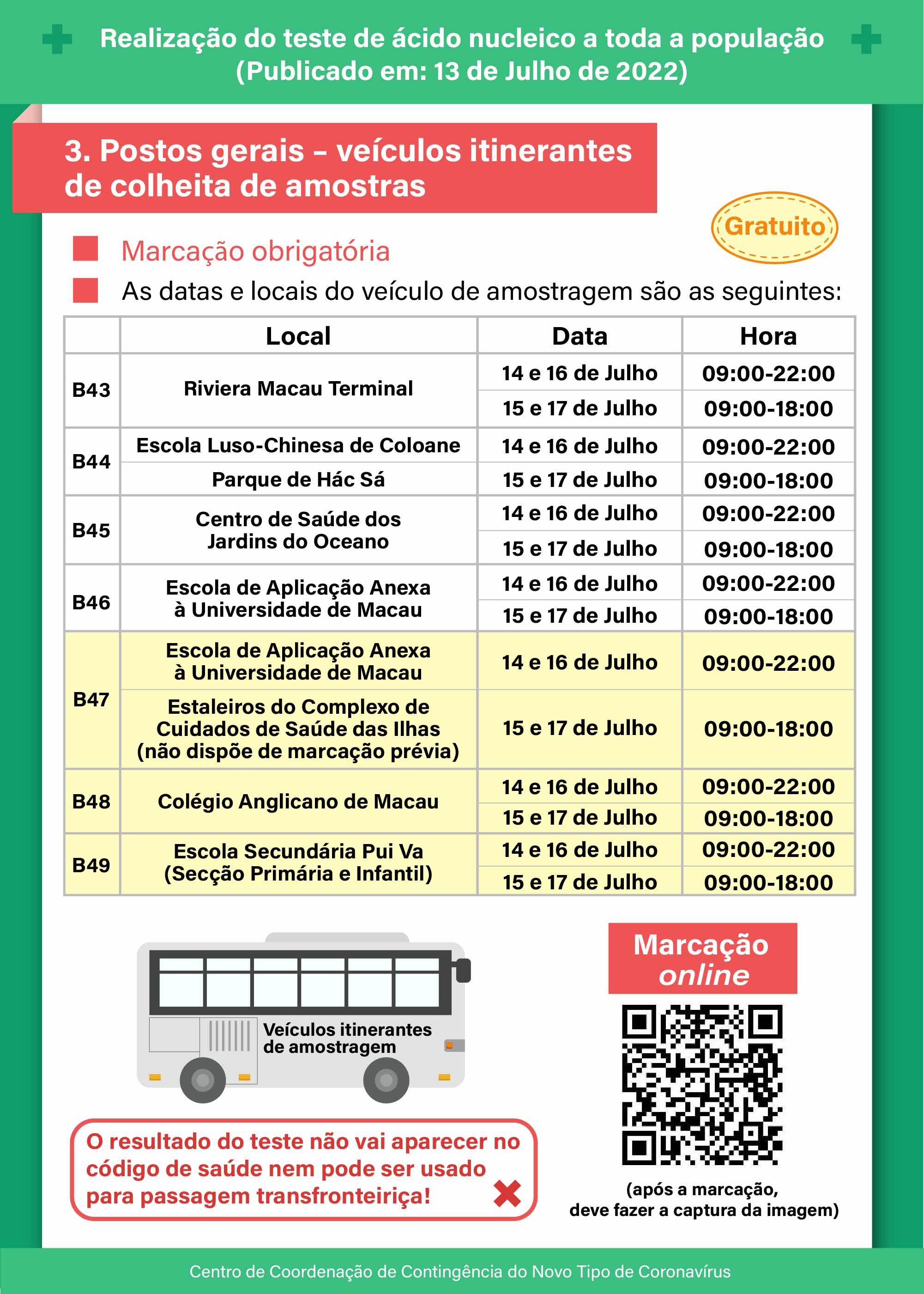 Estes dois veículos funcionarão das 09h00 às 22h00 no dia 14 de Julho e das 09h00 às 18h00 no dia 15 de Julho. Para além disso, o local onde se encontra estacionado o veículo (B47) será ajustado, passará a estar parado na Escola de Aplicação Anexa à Universidade de Macau no dia 14 de Julho, e no estaleiro do Complexo de Cuidados de Saúde das Ilhas no dia 15 de Julho que destinará às pessoas alojadas naquele estaleiro, sem necessidade de fazer marcação prévia.