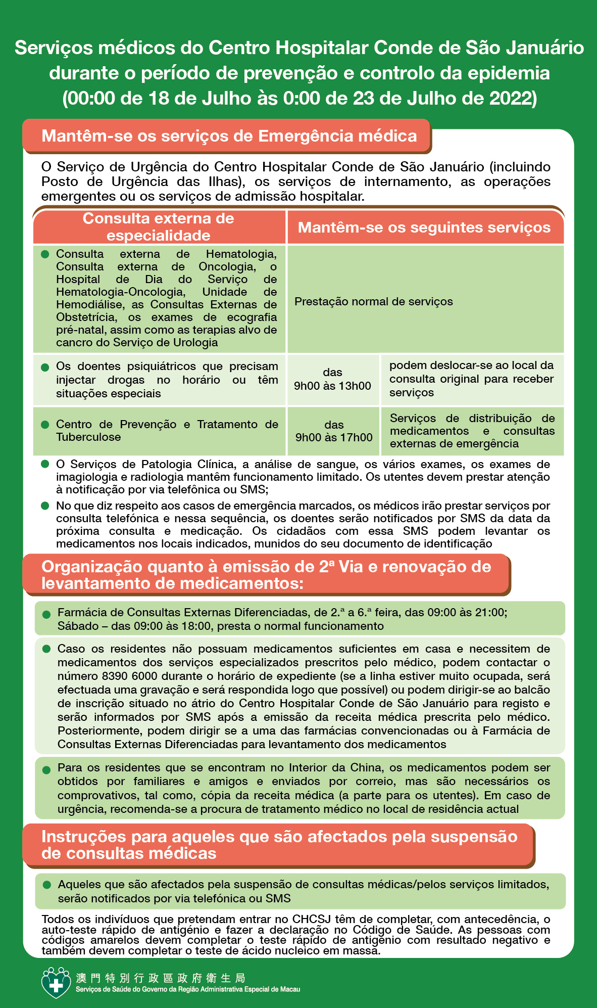 Durante o período de prevenção e controlo da epidemia, os serviços médicos do Centro Hospitalar Conde de São Januário, Centros/Postos de Saúde, emissão de 2ª. Via e renovação do levantamento de medicamentos são disponibilizados da seguinte forma: