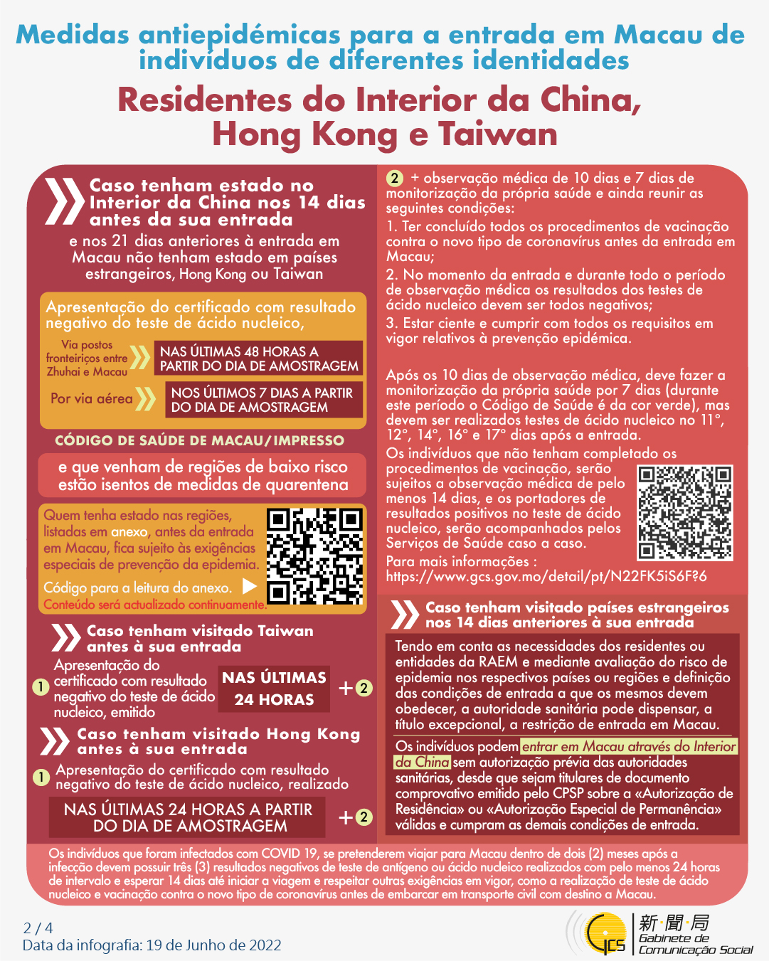 (Infografia)Medidas antiepidémicas para a entrada em Macau de indivíduos de diferentes identidades, actualizadas no dia 18 de Julho de 2022