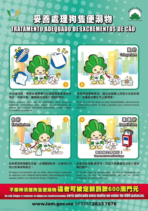 Por outro lado, o IAM apela aos donos que ao passearem os seus cães no período de consolidação, prestem atenção à manutenção de higiene e limpeza do ambiente comunitário. Quando os cães fizerem as suas necessidades ao ar livre, os donos devem colocar no chão matérias absorventes, tais como almofadas absorventes ou jornais antigos, assegurar que os cães evacuem em cima, embrulhar bem os excrementos e deitá-los nas instalações públicas de recolha de lixo, e não violar as disposições do Regulamento Geral dos Espaços Públicos, contribuindo em conjunto para a manutenção da higiene ambiental e boa execução dos trabalhos antiepidémicos.