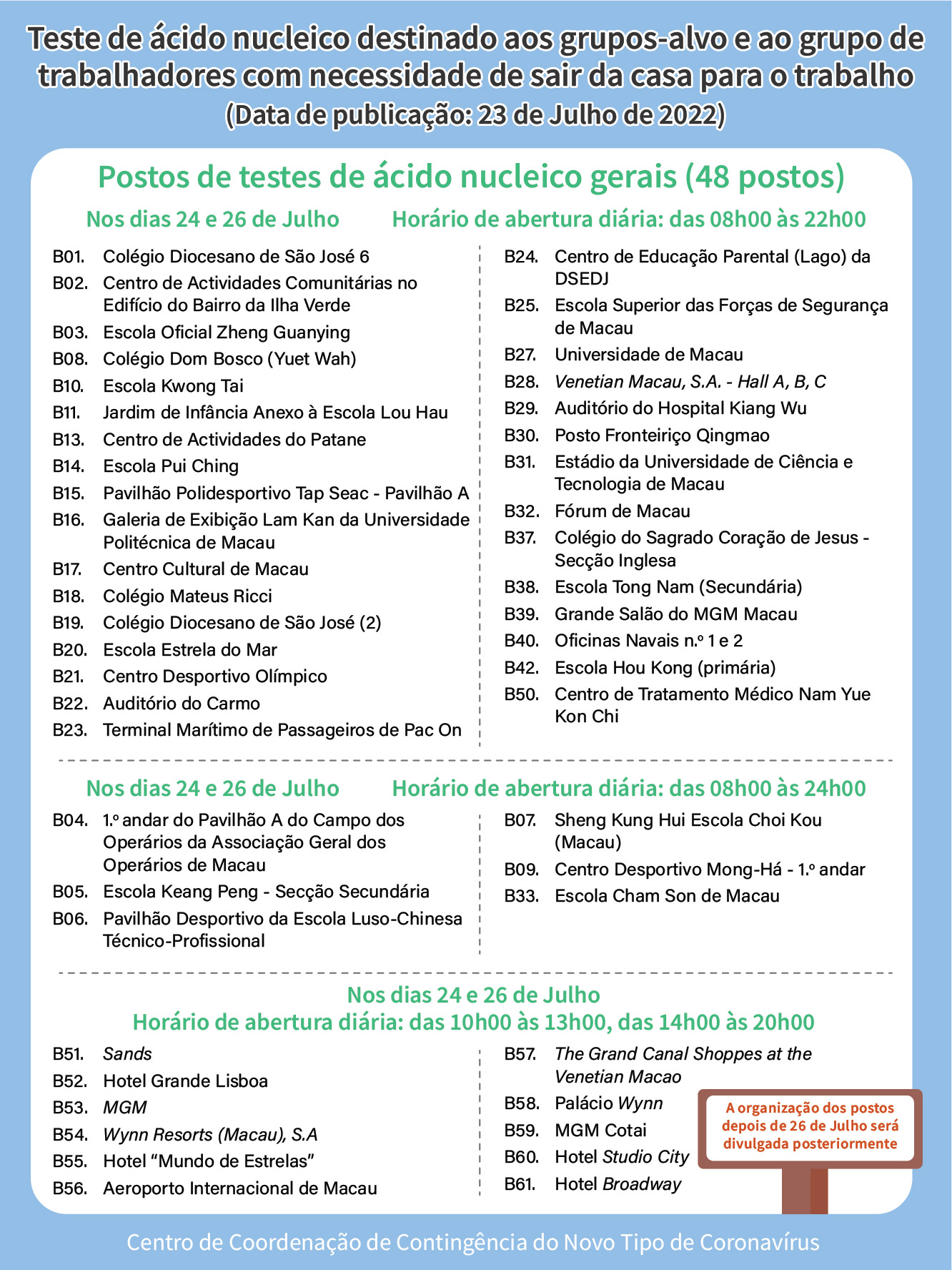- 48 postos gerais (com marcação obrigatória), o horário de funcionamento é das 08h00 às 22h00 entre os dias 24 e 26 de Julho; em que o horário de funcionamento de 6 postos gerais prorroga até as 24h00, a saber: 1.º andar do Pavilhão A do Campo dos Operários da Associação Geral dos Operários de Macau, Escola Keang Peng - Secção Secundária, Instalações Desportivas Cobertas da Escola Luso-Chinesa Técnico-Profissional, Sheng Kung Hui Escola Choi Kou (Macau), Centro Desportivo Mong-Há, 1.º andar, Escola Cham Son de Macau. Além disso, o horário de funcionamento dos postos de teste de ácido nucleico em hotéis (excepto Venetian Macau, S.A., salões A, B e C e Grande Salão do MGM Macau) e no Aeroporto Internacional de Macau (B51-B61)entre os dias 24 e 26 de Julho é das 10h00 às 13h00 e das 14h00 às 20h00.