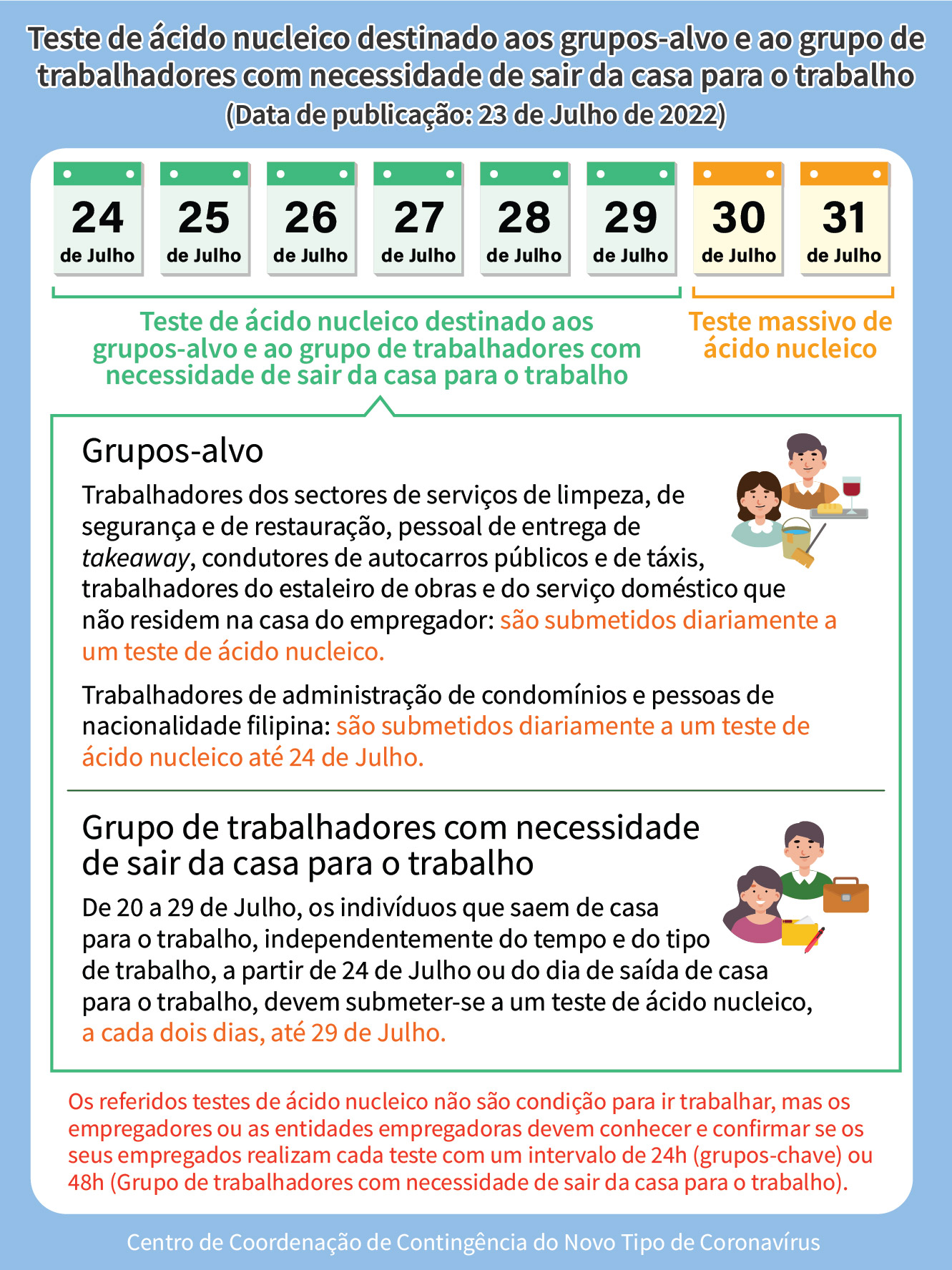 - Grupo de trabalhadores com necessidade de sair de casa para o trabalho : aqueles que tenham saído de casa para o trabalho entre os dias 20 e 29 de Julho, independentemente do número de horas de trabalho e do tipo de trabalho, devem efectuar um teste de ácido nucleico em cada 2 dias, a partir do dia 24 de Julho ou, a partir do dia da saída de casa para o trabalho até ao dia 29 de Julho.