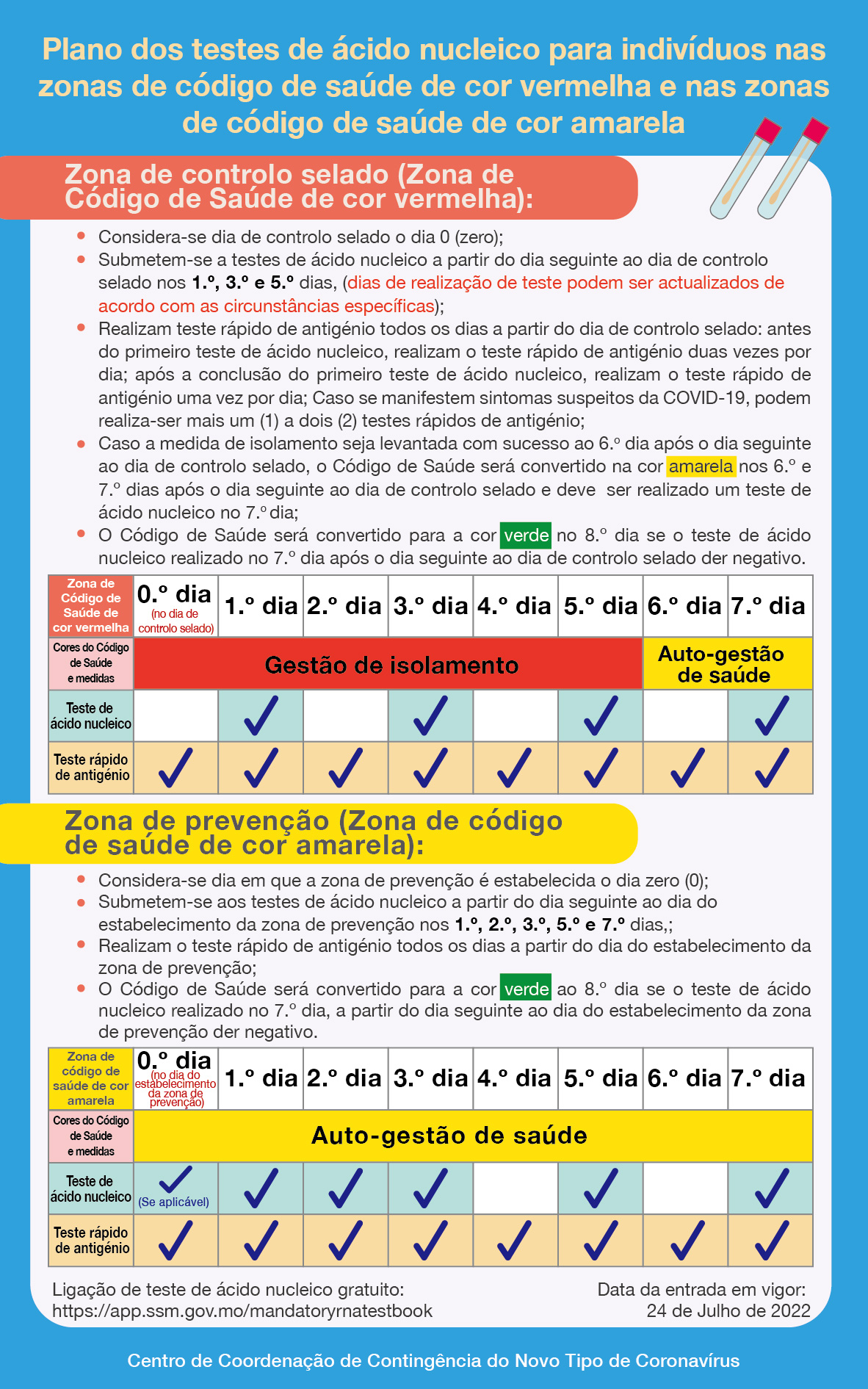 • plano dos testes de ácido nucleico para indivíduos nas zonas de código de saúde de cor vermelha e nas de código de saúde de cor amarela