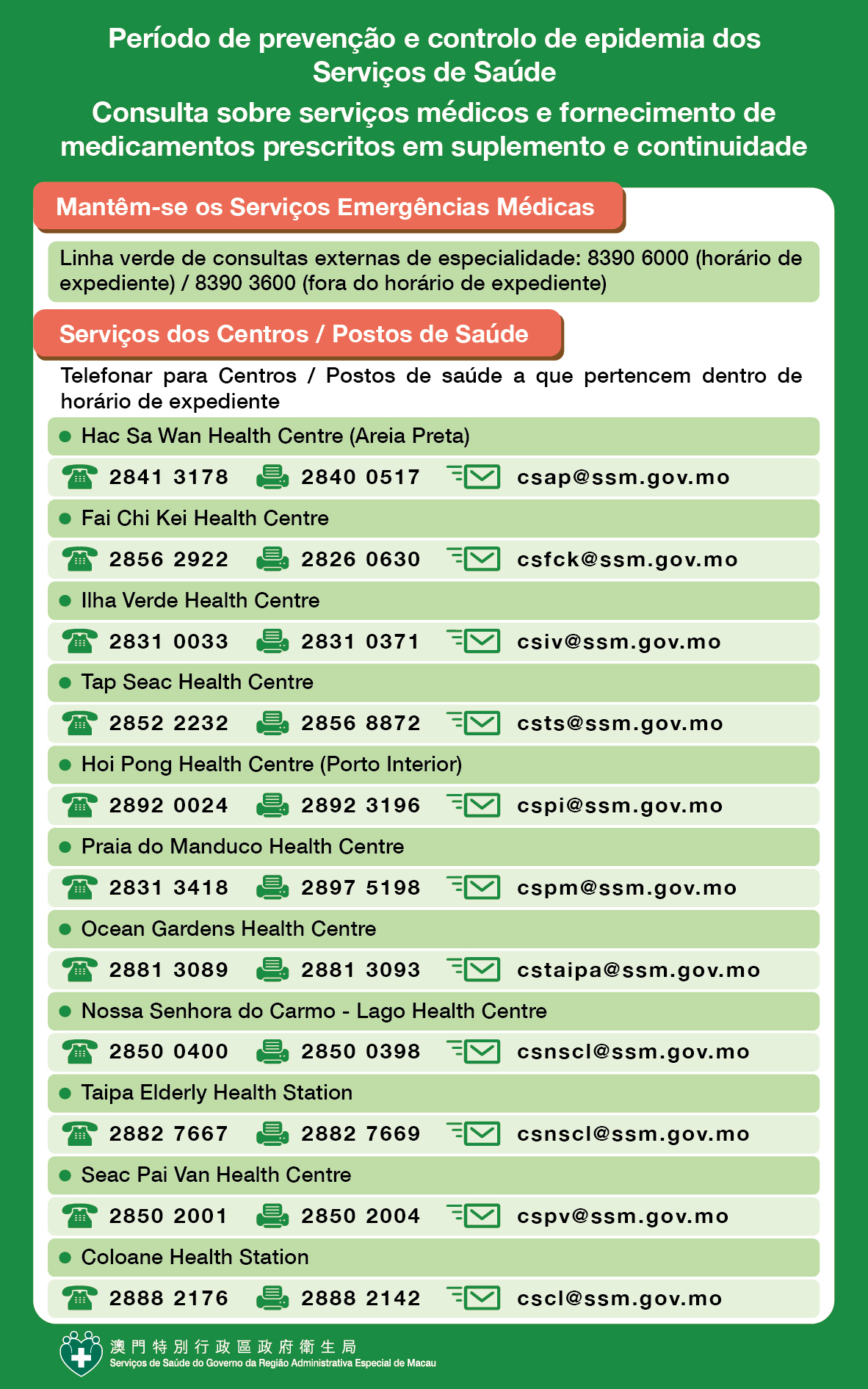 Caso os residentes tiverem alguma dúvida, podem recorrer à linha aberta dos Centros de Saúde relevantes durante o horário de expediente: Centro de Saúde do Fai Chi Kei: 2856 2922, Centro de Saúde da Areia Preta: 2841 3178, Centro de Saúde da Ilha Verde: 2831 0033, Centro de Saúde do Tap Seac: 2852 2232, Centro de Saúde de Praia do Manduco: 2831 3418, Centro de Saúde do Porto Interior: 2892 0024, Centro de Saúde de Nossa Senhora do Carmo – Lago: 2850 0400, Centro de Saúde dos Jardins do Oceano: 2881 3089, Centro de Saúde de Seac Pai Van: 2850 2001, Posto de Saúde de Coloane: 2888 2176.
