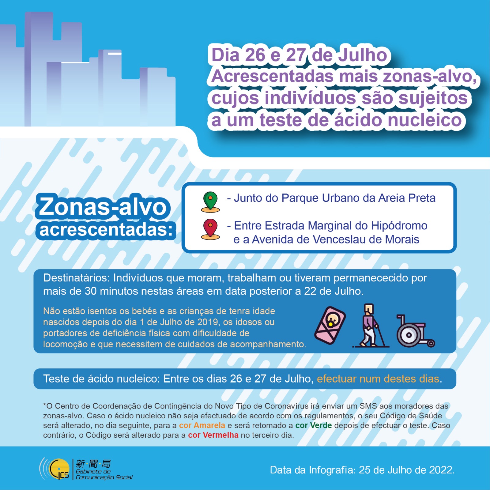 (Infografia) Dia 26 e 27 de Julho acrescentadas mais zonas-alvo, cujos indivíduos são sujeitos a um teste de ácido nucleico