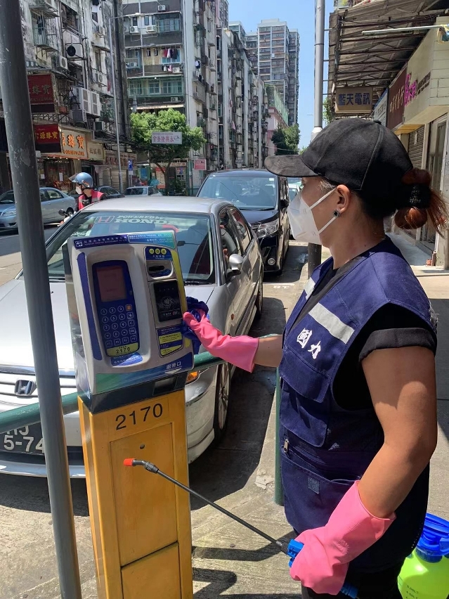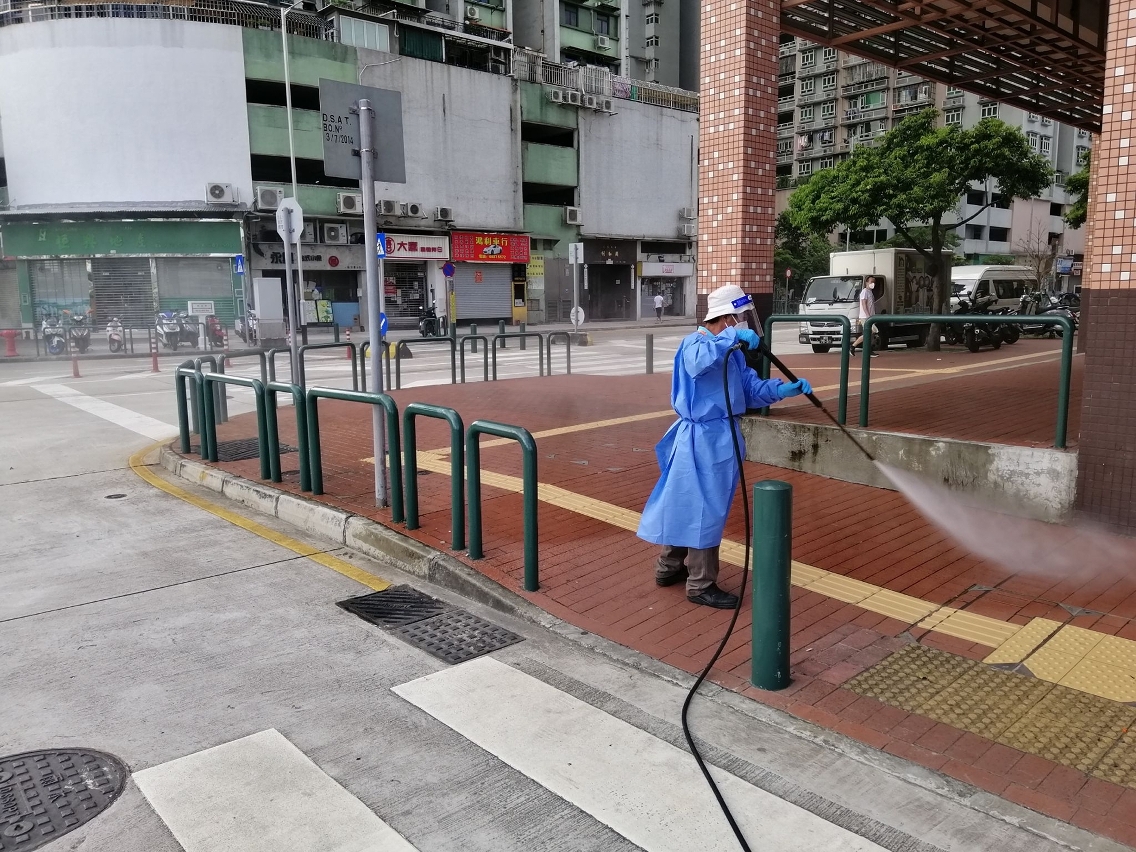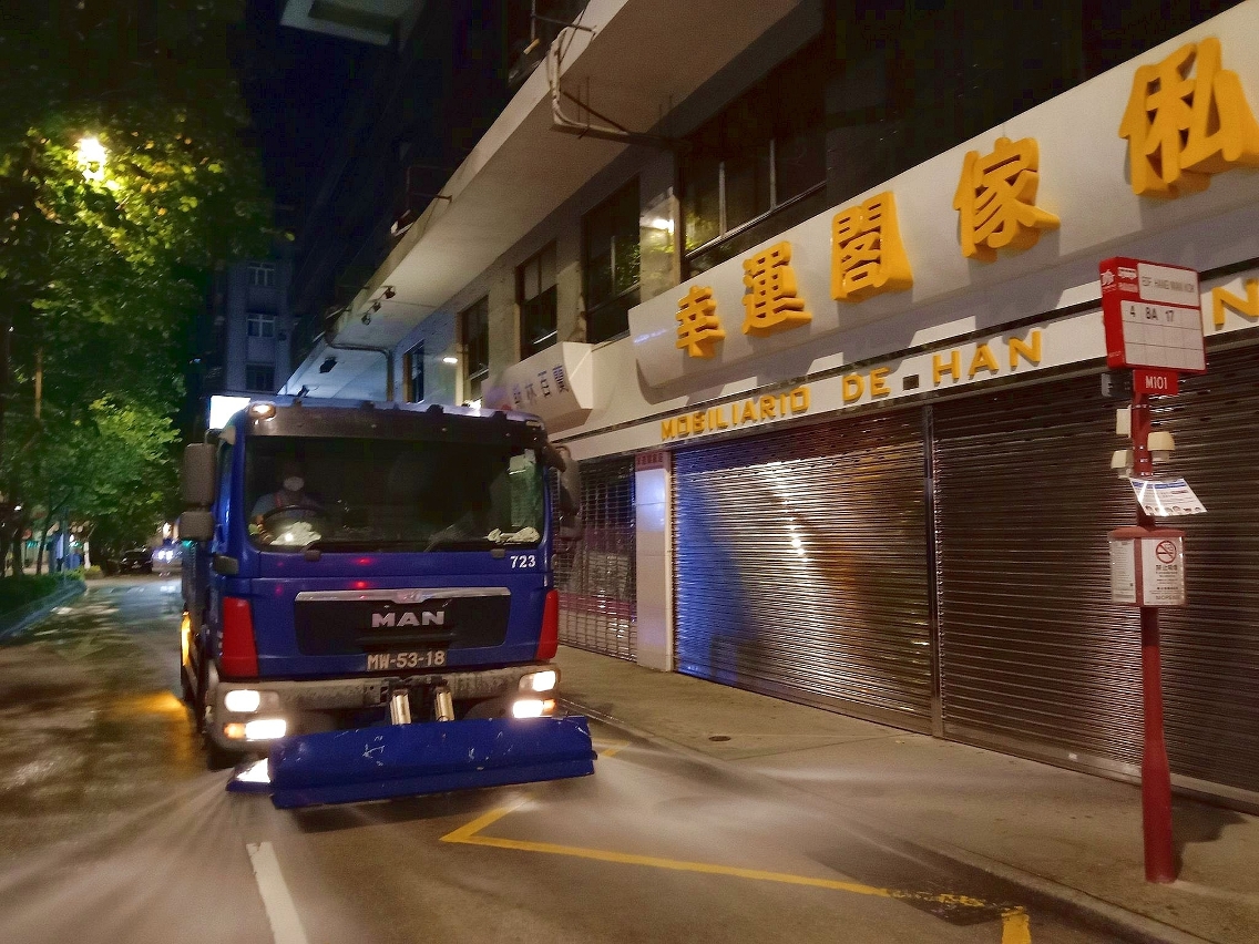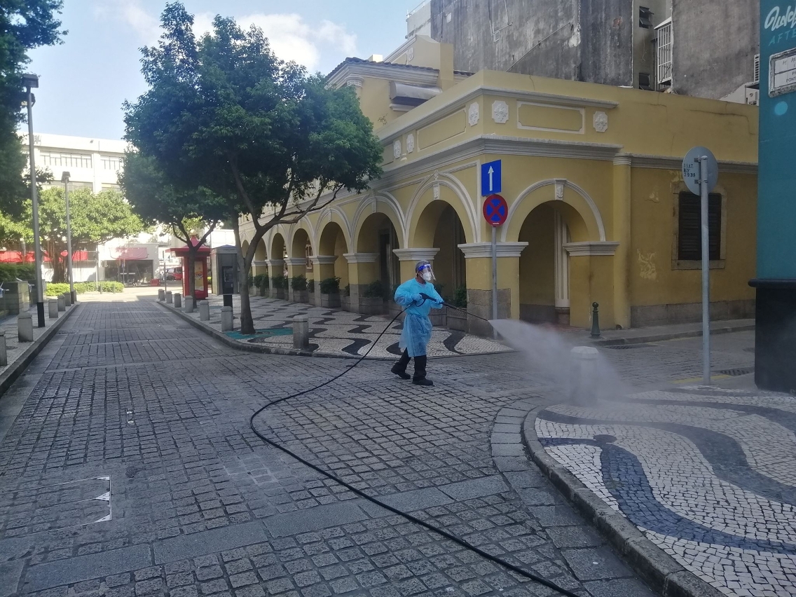 Desde o início do actual surto de casos positivos, o IAM, de acordo com as orientações antiepidémicas emitidas pelos Serviços de Saúde, tem coordenado constantemente com a CSR Macau para destacar mais pessoal e veículos de limpeza de ruas para todos os bairros de Macau, limpando as vias pedonais e rodoviárias com pistola de água de alta pressão e alvejante diluído. Simultaneamente, duplicou o números de trabalhadores enviados para proceder à limpeza, com alvejante diluído, dos corrimãos das escadas rolantes, abrigos para paragens de autocarros, placas indicadoras das paragens, parquímetros e outras instalações públicas, e à pulverização com líquido desinfectante das bocas de esgoto públicas, corrimãos e vedações das vias pedonais, a fim de garantir a higiene e a limpeza ambiental dos bairros.