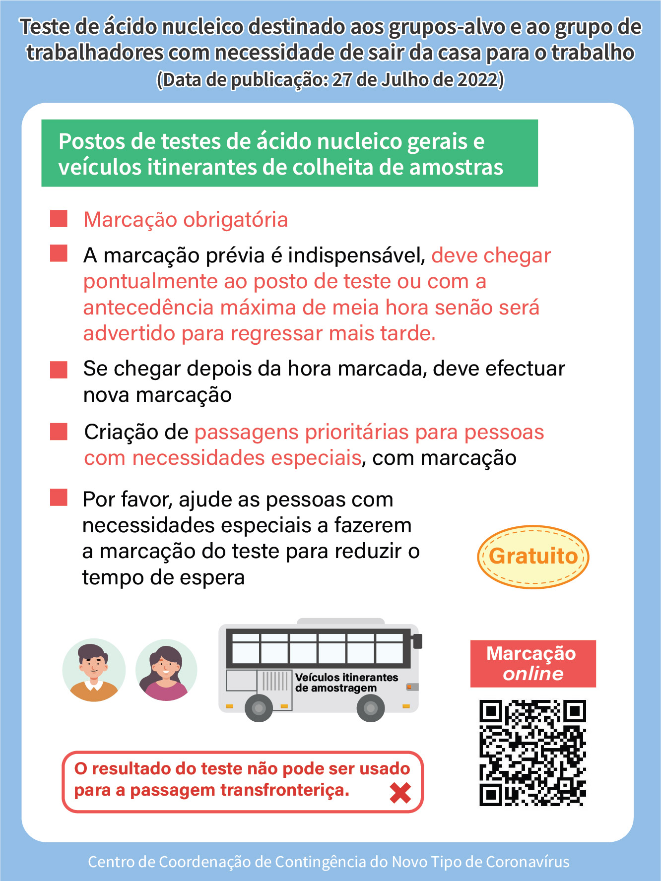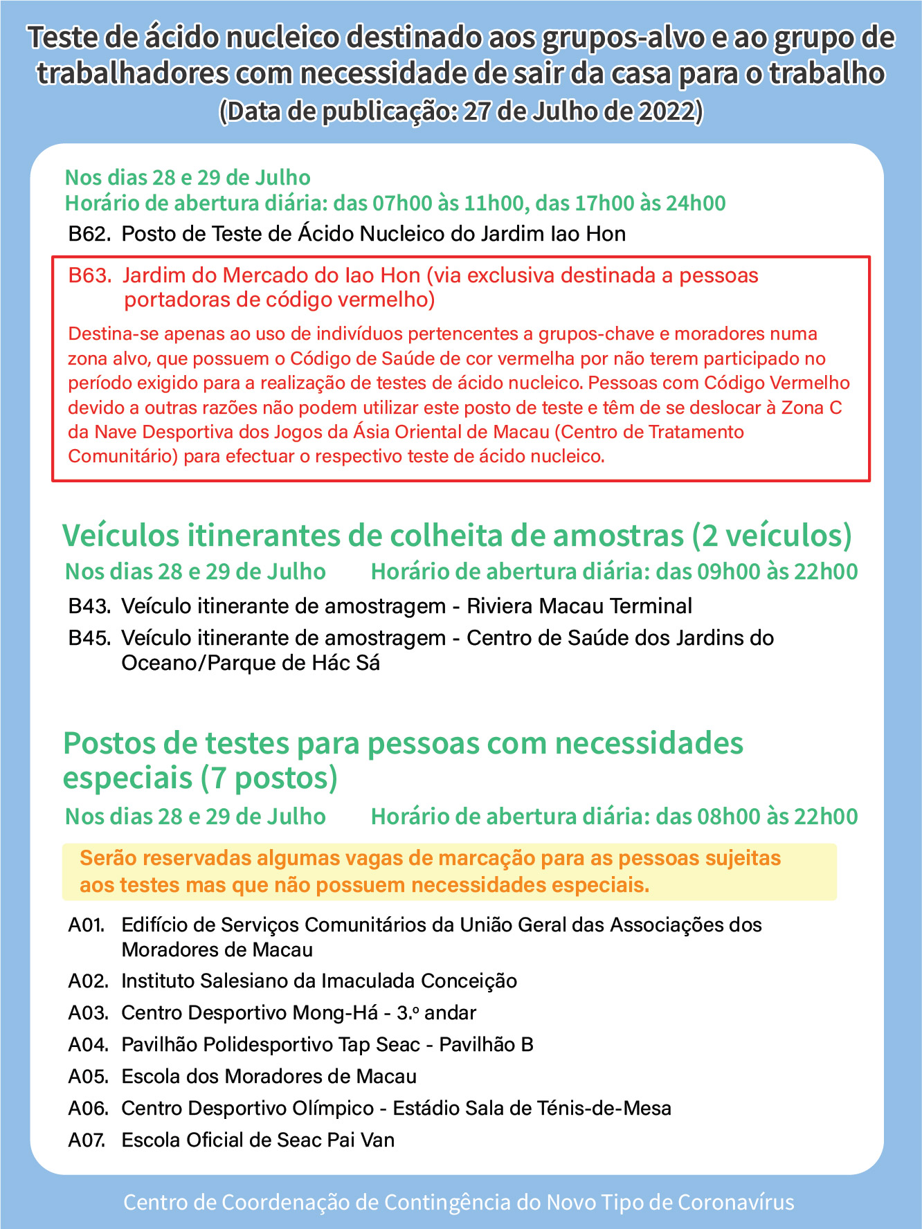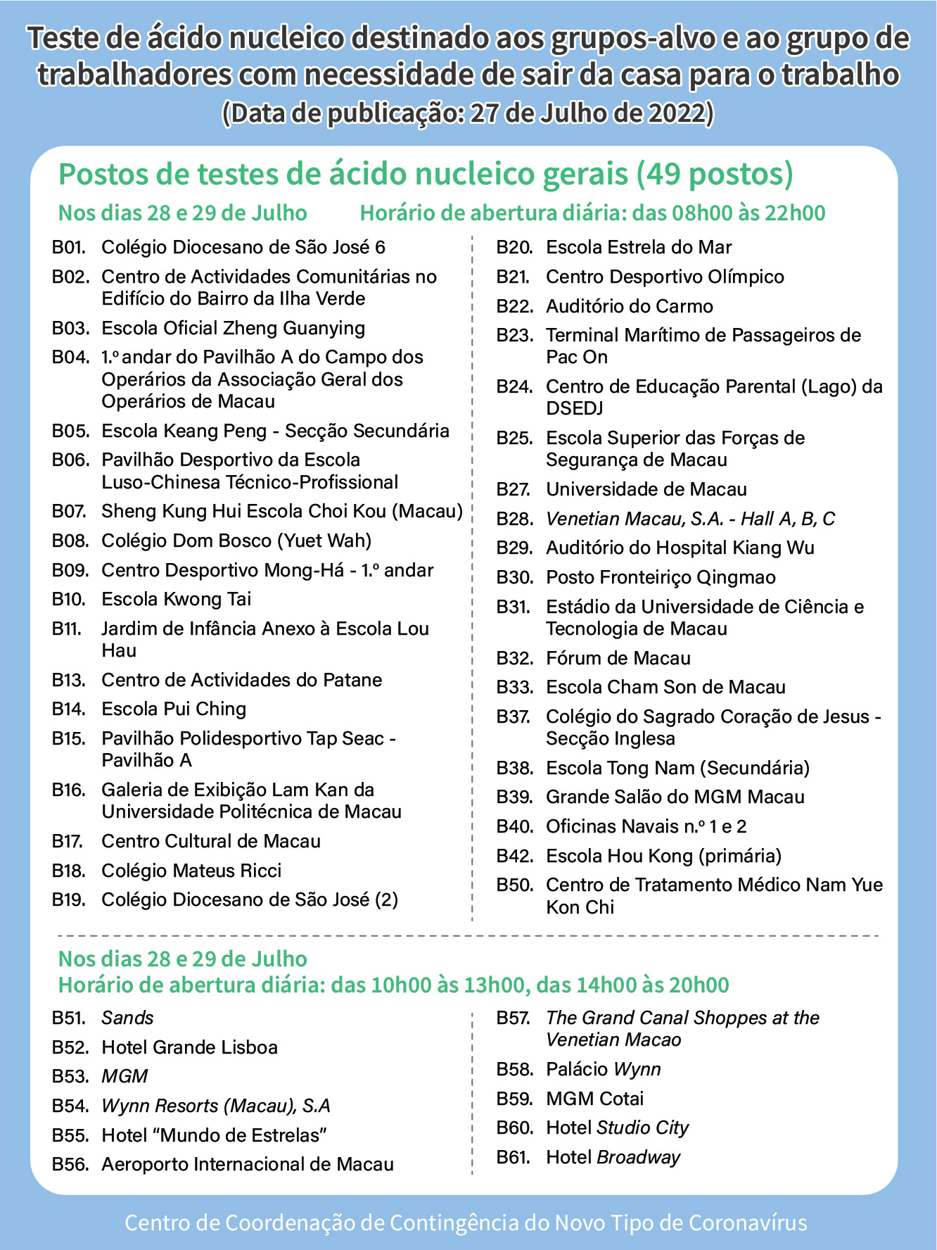 O Centro de Coordenação de Contingência do Novo Tipo de Coronavírus informou que, após revisão das necessidades de testes de ácido nucleico destinados às pessoas das áreas-chave, grupos-alvo e grupo de trabalhadores, com necessidades de sair de casa para o trabalho, o horário de funcionamento será alterado, a partir de amanhã (dia 28 de Julho), das 08h00 às 22h00, nos seguintes seis postos e um posto de testes para pessoas com necessidades especiais: