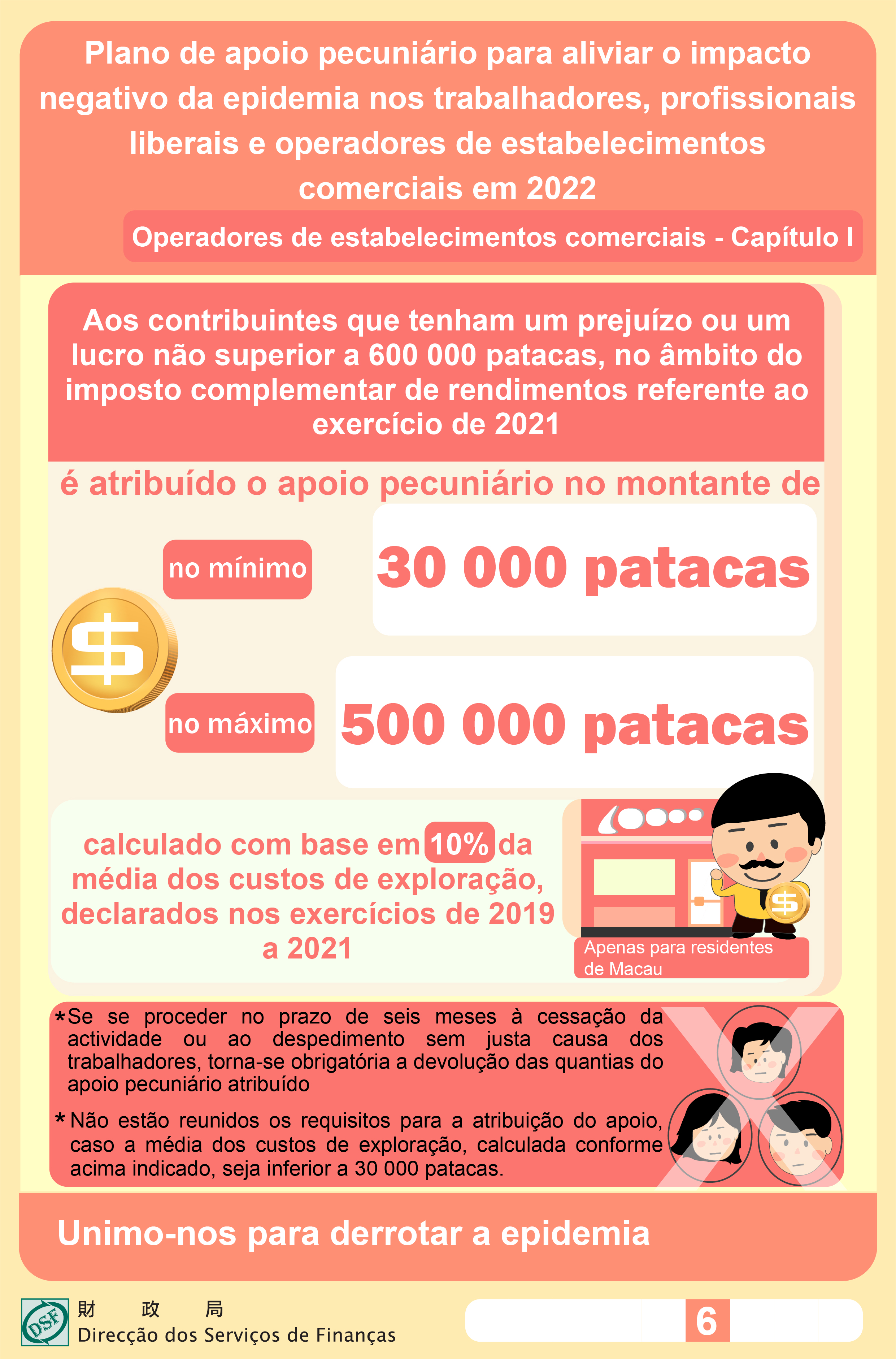 A cada indivíduo, inscrito na DSF como contribuinte (sem contemplar os não residentes de Macau, no caso de os beneficiários serem pessoas singulares) do imposto complementar de rendimentos, que tenha declarado, na soma total dos resultados do exercício, a favor dos diversos estabelecimentos comerciais por ele explorados, a inexistência de lucros ou a existência de lucros cujo montante não seja superior a 600.000 patacas, no âmbito do imposto complementar de rendimentos referente ao exercício de 2021, é atribuído o apoio pecuniário no valor-limite mínimo de 30.000 patacas e no máximo de 500.000 patacas, calculado com base em 10% da soma total da média dos custos do exercício declarados nos exercícios de 2019 a 2021, efectuados pelos estabelecimentos comerciais que reúnam os requisitos de atribuição.
