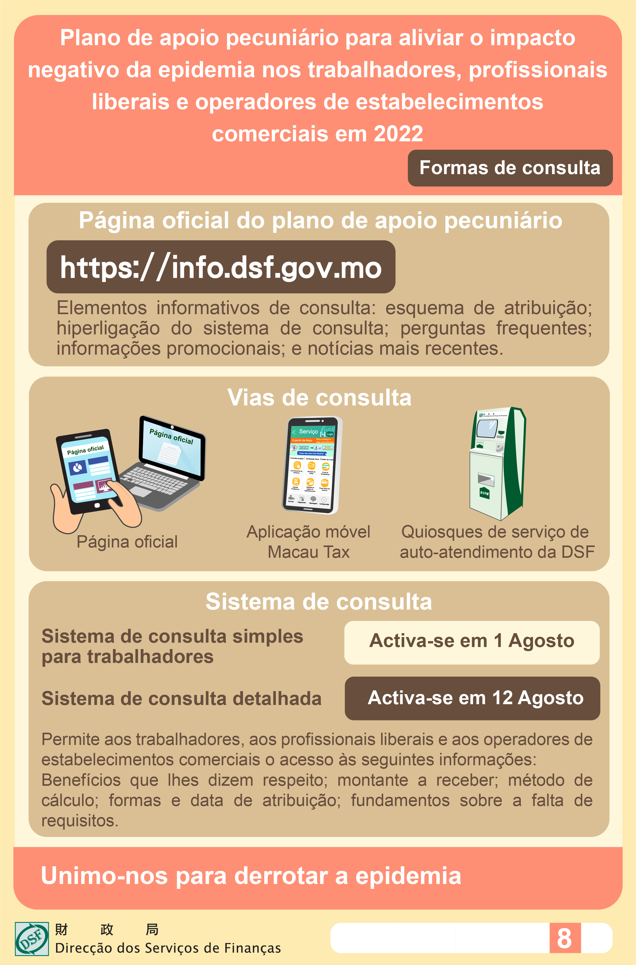 Em 1 de Agosto vai ser lançada pela DSF a página electrónica exclusiva ( https://info.dsf.gov.mo ) onde se disponibilizam, em detalhe, as informações relativas ao apoio pecuniário, mormente, o esquema da atribuição, o sistema de consulta, as perguntas mais frequentes, as informações promocionais, as notícias mais recentes, entre outras.