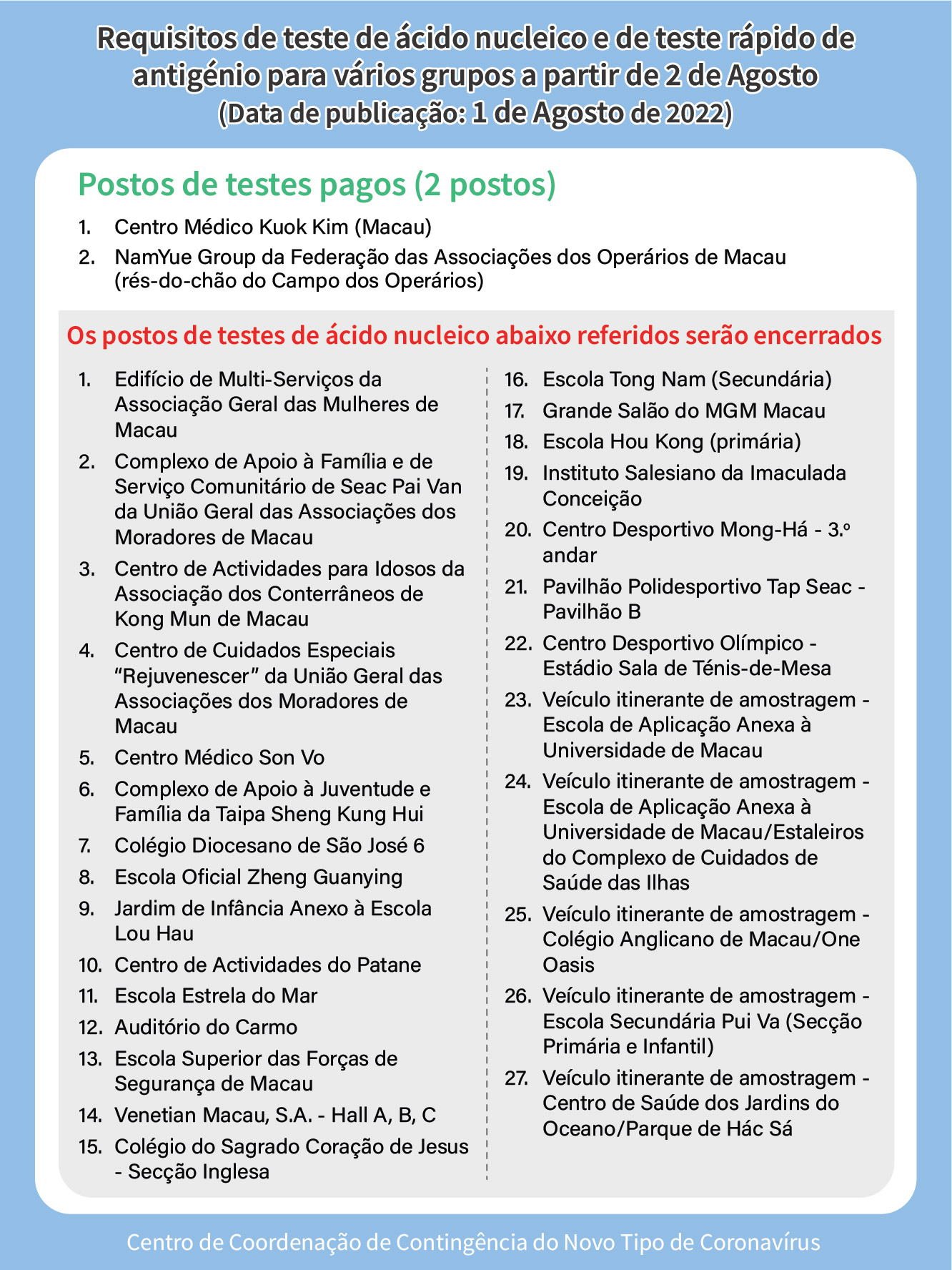 O Centro de Coordenação de Contingência do Novo Tipo de Coronavírus informa que, após a análise de risco, no dia 2 de Agosto (terça-feira), os grupos-chave e o grupo de trabalhadores, com necessidade de saírem de casa para o trabalho, têm de realizar os seguintes testes, a saber: