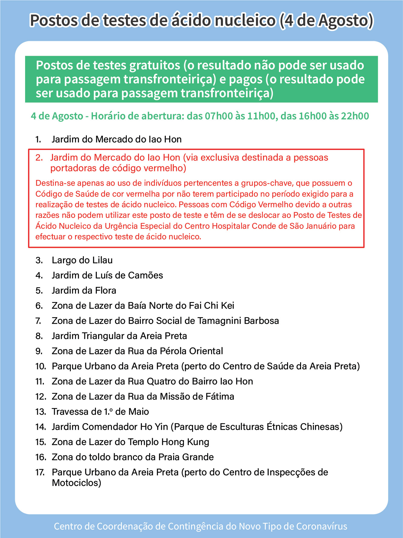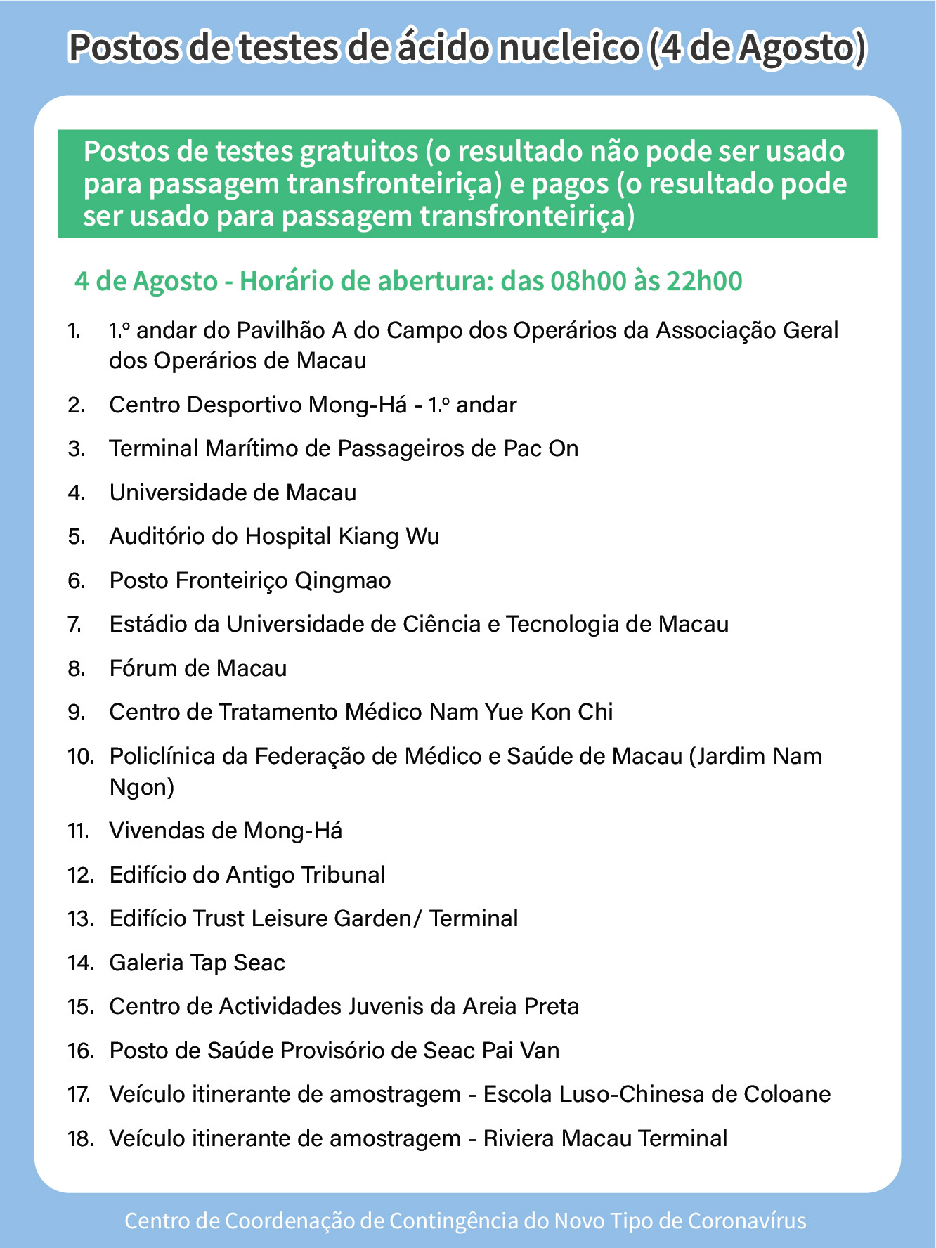 I. Postos de teste de ácido nucleico gratuitos (não servem para efeitos de passagem fronteiriça) – Horário de funcionamento: 08h00 às 22h00.