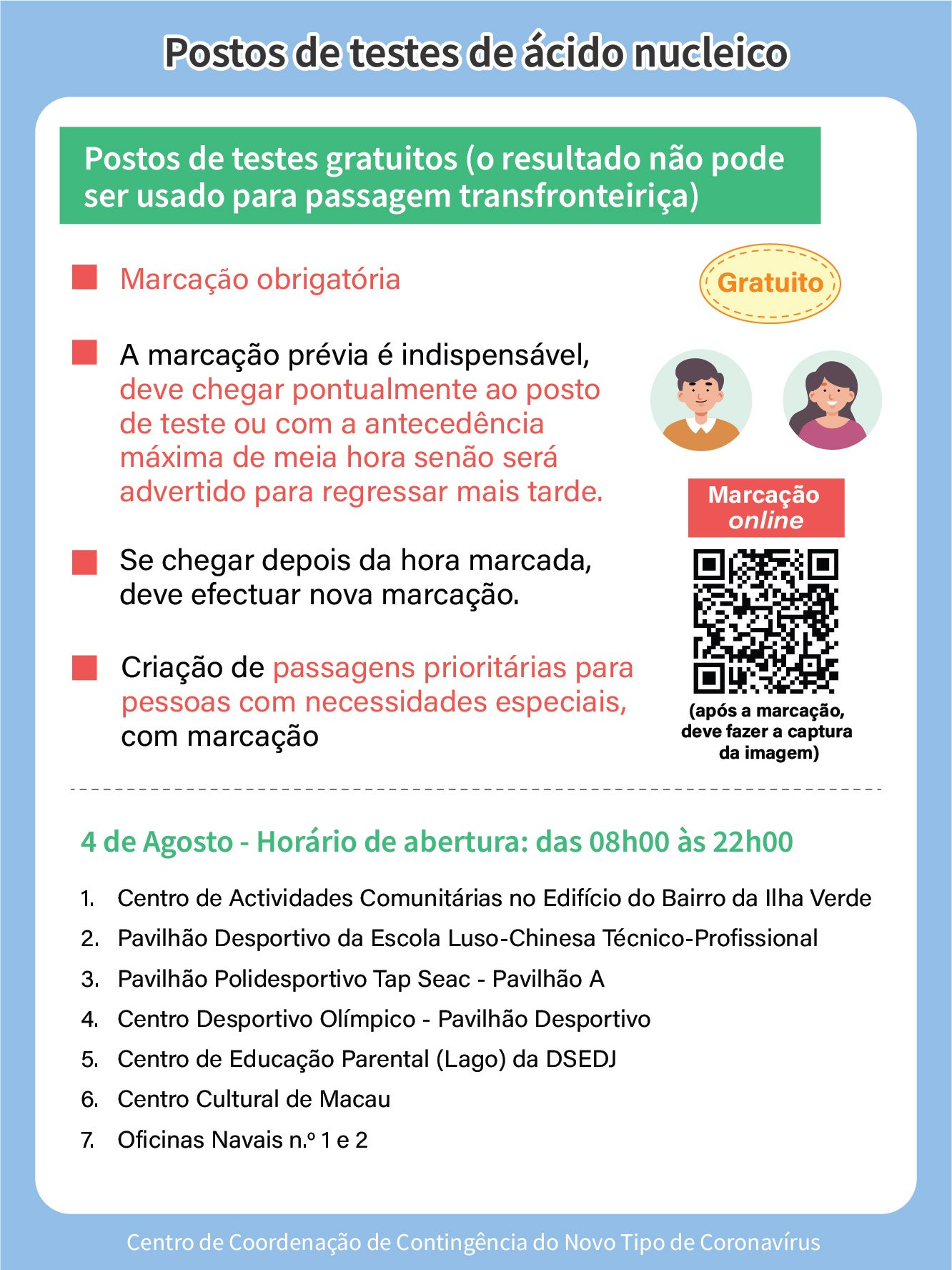 - As pessoas que pretendam realizar testes gratuitos neste postos de usar a ligação electrónica de agendamento destinado aos postos gratuitos. Ao entrar no posto, devem exibir o código de saúde. O resultado do teste será visível no Código de Saúde de Macau, mas não pode ser usado para a passagem fronteiriça.