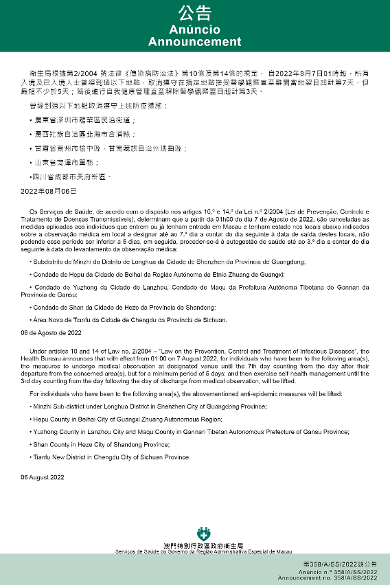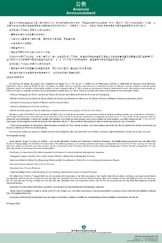 Tendo em consideração a evolução epidemiológica mais actualizada no Interior da China, os Serviços de Saúde, de acordo com o disposto nos artigos 10.º e 14.º da Lei n.º 2/2004 (Lei de Prevenção, Controlo e Tratamento de Doenças Transmissíveis), determinam que a partir da 01h00 do dia 7 de Agosto de 2022, são aplicadas ou canceladas as medidas a todos os indivíduos que entrem ou já tenham entrado em Macau e tenham estado nos locais abaixo indicados, devem ser sujeitos à observação médica em local a designar até ao 7.º dia a contar do dia seguinte à data de saída destes locais, não podendo esse período ser inferior a 5 dias; em seguida, proceder-se-á à autogestão de saúde até ao 3.º dia a contar do dia seguinte à data do levantamento da observação médica: