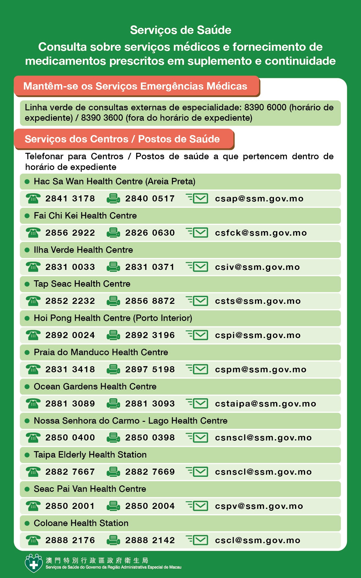 - Centro de Saúde da Areia Preta, Centro de Saúde do Fai Chi Kei, Centro de Saúde da Ilha Verde, Centro de Saúde do Tap Seac, Centro de Saúde de Praia do Manduco, Centro de Saúde de Nossa Senhora do Carmo – Lago e Centro de Saúde dos Jardins do Oceano (das 14h00 às 17h30).