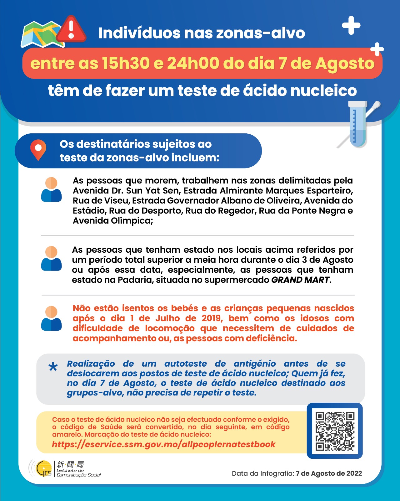 (Infografia) Indivíduos nas zonas-alvo têm de fazer um teste de ácido nucleico, entre as 15h30 e 24h00 do dia 7 de Agosto