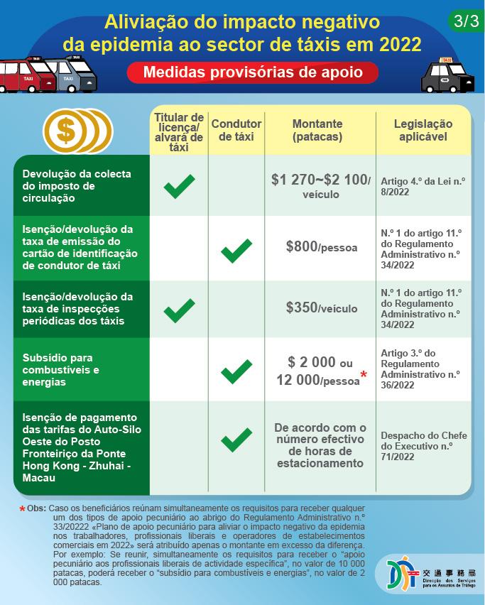 Desde o início desta nova ronda da epidemia até à presente data, o Governo da RAEM lançou, sucessivamente, várias medidas provisórias de apoio aos condutores e titulares de alvarás de táxis: devolução da colecta do imposto de circulação dos automóveis ligeiros de aluguer do ano 2022, isenção/devolução da taxa de emissão do cartão de identificação de condutor de táxi e da taxa de inspecções periódicas dos táxis, isenção, até ao final do corrente ano, de pagamento das tarifas do Auto-Silo Oeste do Posto Fronteiriço da Ponte Hong Kong-Zhuhai-Macau, entre outras.