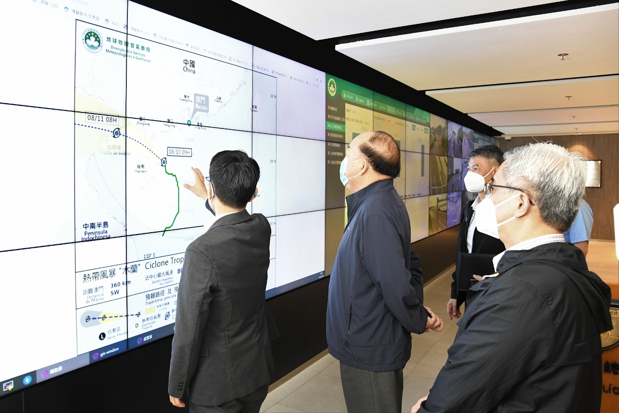 Durante o içar do sinal n.º 8 de tempestade tropical, o Chefe do Executivo deslocou-se ao COPC, onde ouviu as apresentações dos relatórios dos membros da estrutura de protecção civil sobre os trabalhos de resposta à passagem do ciclone tropical “Mulan”, e deu instruções quanto à prevenção dessa tempestade tropical e de inundação, com vista a garantir a segurança da vida e dos bens da população de Macau. De seguida, acompanhado pelo Secretário para a Segurança e Comandante de Acção Conjunta (CAC), Wong Sio Chak, Comandante-geral dos Serviços de Polícia Unitários e Coadjuvante do CAC, Leong Man Cheong, e o Director-geral dos Serviços de Alfândega, Vong Man Chong, entre outros responsáveis, o Chefe do Executivo efectuou uma vistoria no COPC para se inteirar da situação de funcionamento do mesmo.