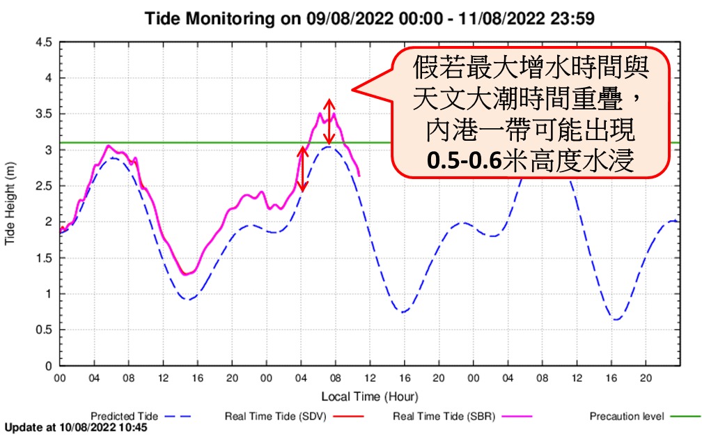 Devido à influência da maré astronómica, combinada com o “Storm Surge” e com a chuva contínua, esta Direcção emitiu o Aviso de “Storm Surge” amarelo às 18:00 horas no dia 9 de Agosto. Se a hora da altura máxima da água se tivesse sobreposto à hora da maré astronómica, podiam esperar-se inundações entre 0,5 e 0,6 metros em zonas do Porto Interior (Figura 5). Dado que não houve sobreposição do "Storm Surge" com maré astronómica, a inundação não foi significativa, no entanto, durante a manhã de 10 de Agosto, houve uma inundação de até 0,15 metros no sul do Porto Interior (Figura 6).