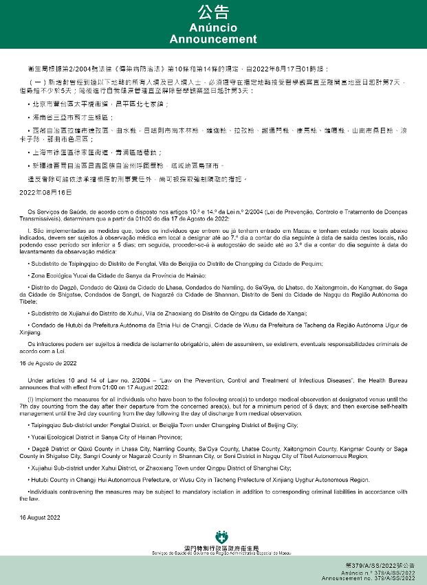 Tendo em consideração a evolução epidemiológica mais actualizada no Interior da China, os Serviços de Saúde, de acordo com o disposto nos artigos 10.º e 14.º da Lei n.º 2/2004 (Lei de Prevenção, Controlo e Tratamento de Doenças Transmissíveis), determinam que a partir da 01h00 do dia 17 de Agosto de 2022, são implementadas ou canceladas as medidas antiepidémicas para quem tenha estado em diversas áreas do Interior da China: