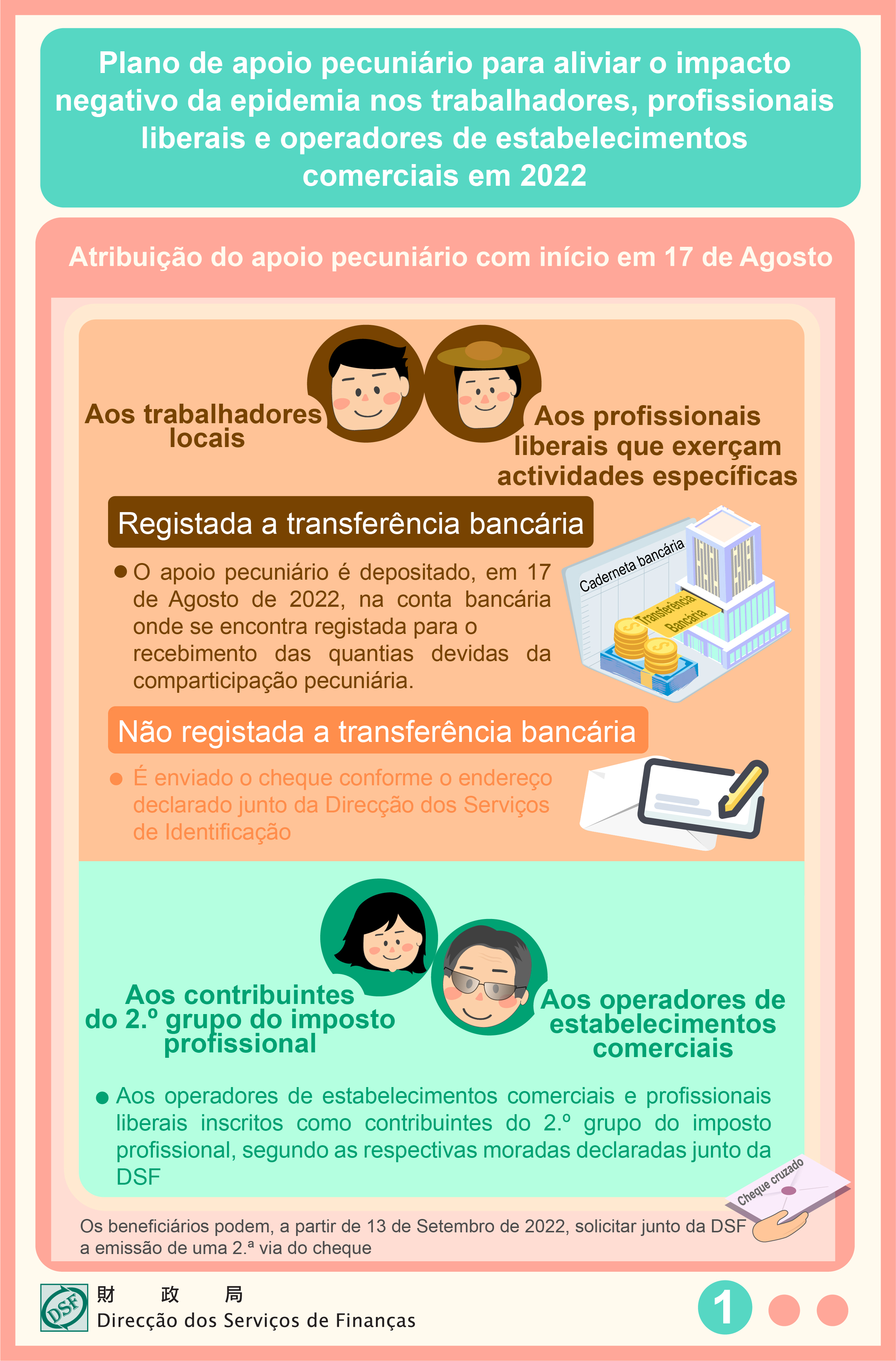 Os cheques do apoio pecuniário vão ser enviados, de forma fraccionada, a partir de 17 de Agosto de 2022. Para os trabalhadores e os profissionais liberais de sectores específicos, que não tenham efectuado o registo da transferência bancária, os respectivos cheques vão ser enviados por via postal, de acordo com as informações inerentes ao endereço registado na Direcção dos Serviços de Identificação; para os operadores de estabelecimentos comercias e os profissionais liberais contribuintes do 2.º grupo do imposto profissional, os respectivos cheques vão ser enviados por via postal, em conformidade com as informações relativa à morada fiscal registada na DSF. Os beneficiários podem, a partir de 13 de Setembro de 2022, solicitar junto da DSF a emissão de uma 2.ª via do cheque.