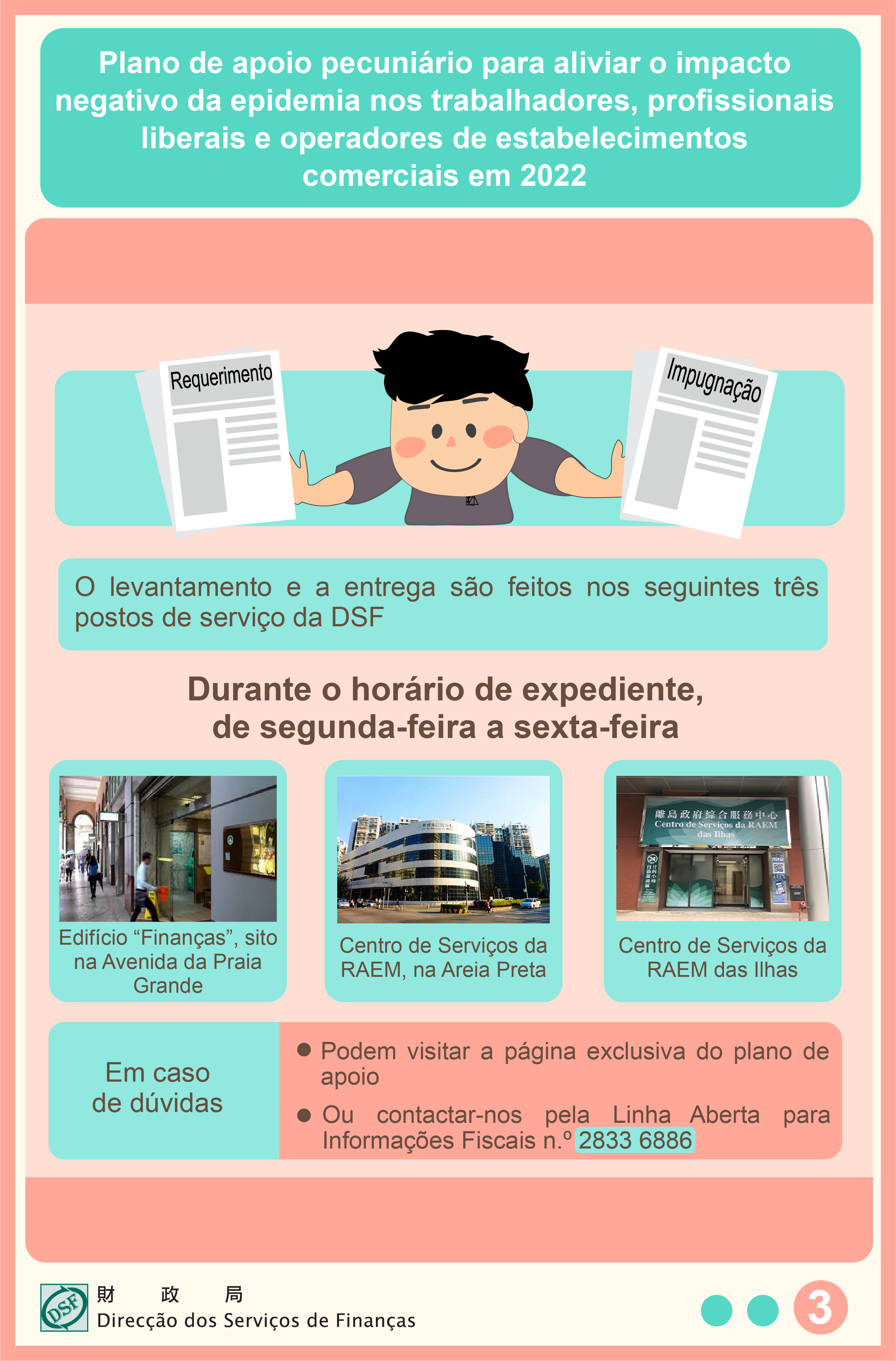 Para mais esclarecimentos, os cidadãos podem visitar a página electrónica exclusiva do plano de apoio ou ligar para a linha aberta para informações fiscais n.º 2833 6886, ou, ainda, deslocar-se, durante a hora de expediente, aos postos de atendimento do Edifício “Finanças”, sito na Av. da Praia Grande, do Centro de Serviços da RAEM, sito na Areia Preta, bem como do Centro de Serviços da RAEM das Ilhas, para efeitos de consulta ou levantamento de requerimento e de impugnação.