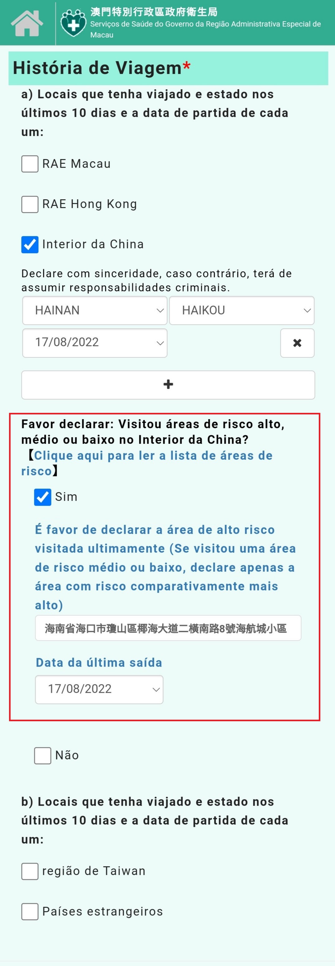 Caso o residente tenha visitado a zona de risco do Interior da China, tem que selecionar “Sim”, e quando esta zona se tratar de uma zona de alto risco, é necessário preencher o local detalhado da última visita desta zona e a data da última partida (ver anexo) .