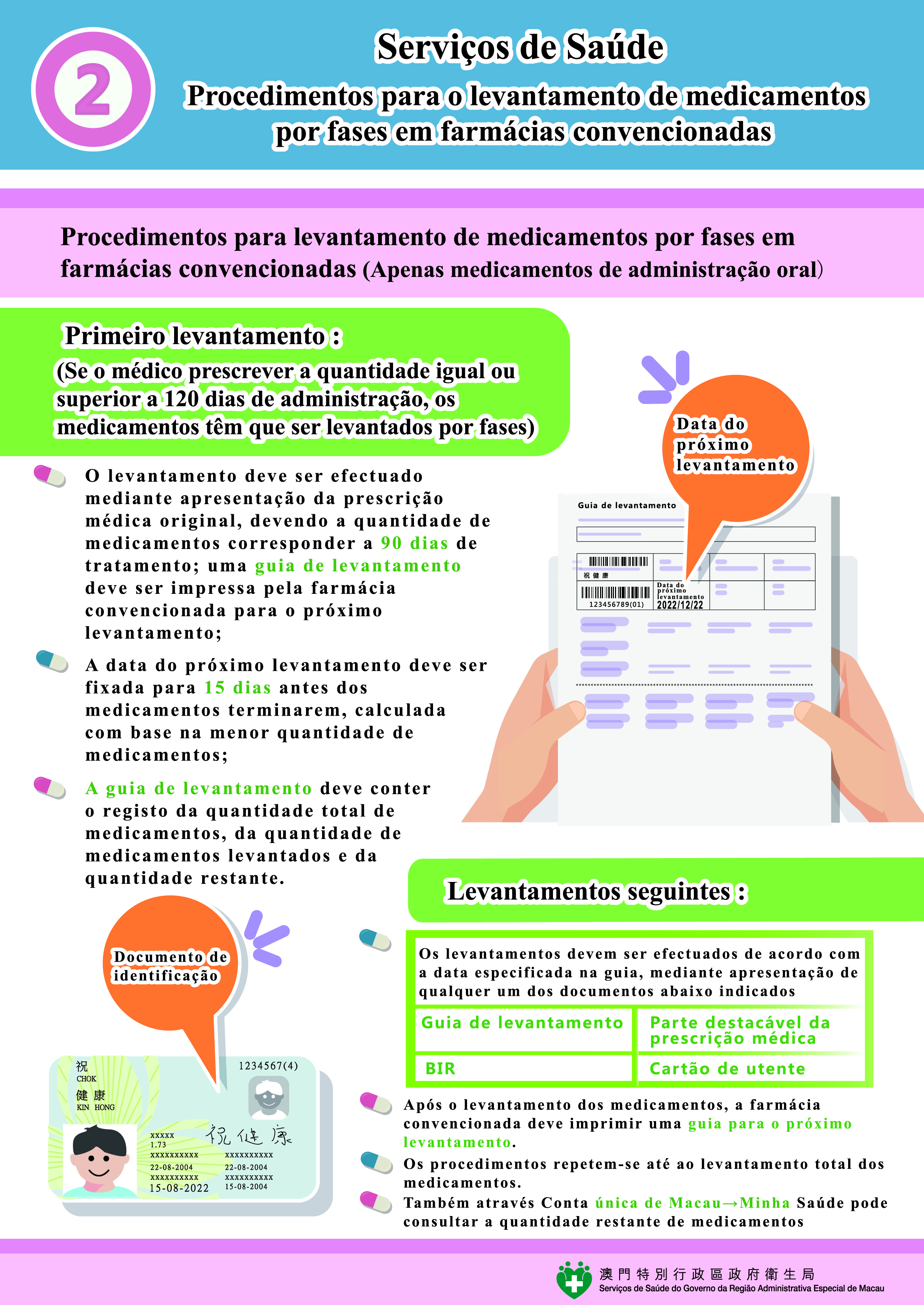 Os utentes devem prestar atenção à conservação adequada da guia de levantamento seguinte de medicamentos, onde está registado a quantidade total de medicamentos, a quantidade de medicamentos levantados bem como a quantidade restante. Os utentes podem dirigir-se a qualquer farmácia convencionada consoante a data especificada na guia de levantamento seguinte dos medicamentos. Em caso de extravio, os medicamentos podem ser levantados mediante apresentação da parte destacável da prescrição médica original, do original do BIR ou do Cartão de Utente dos Serviços de Saúde.