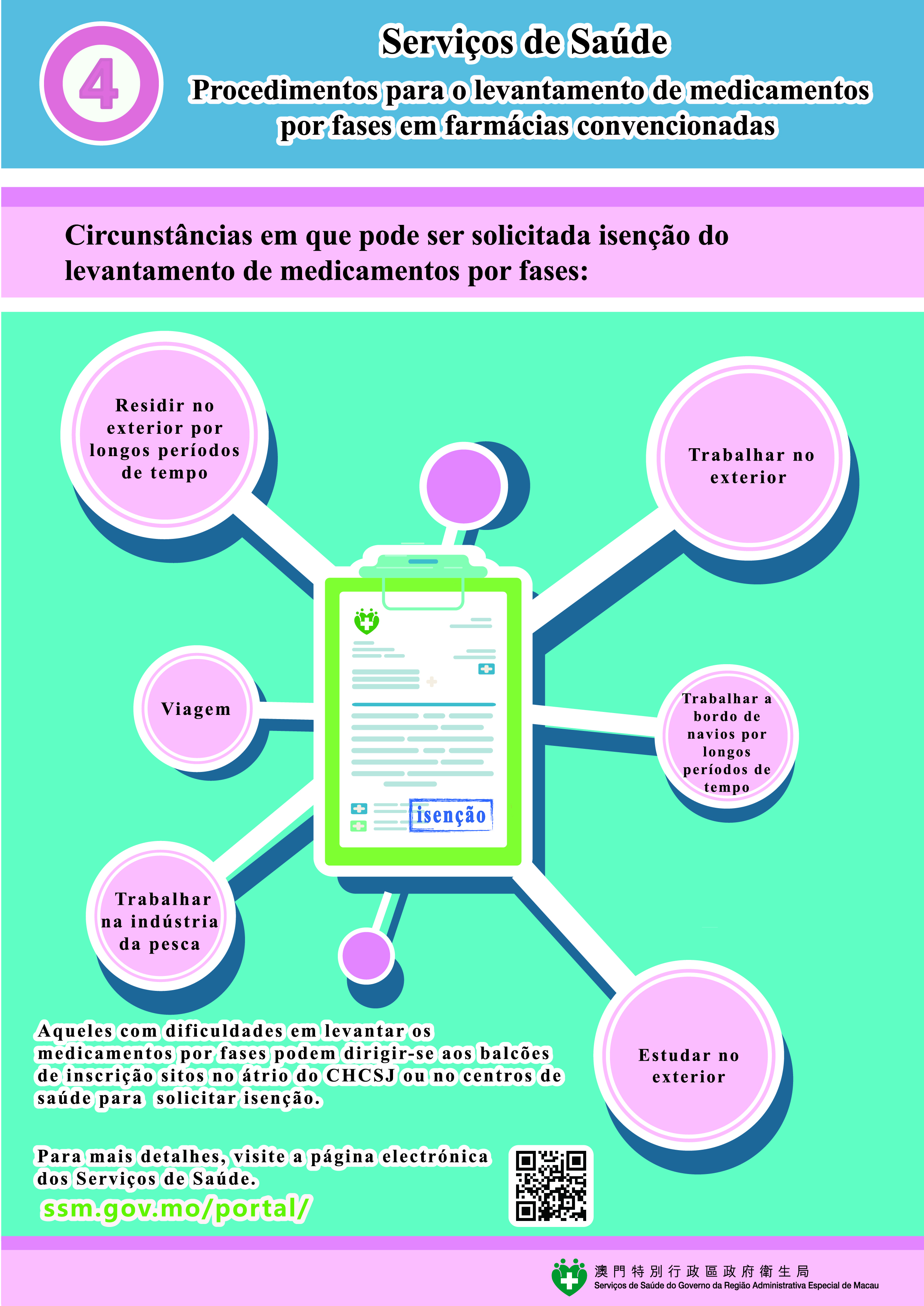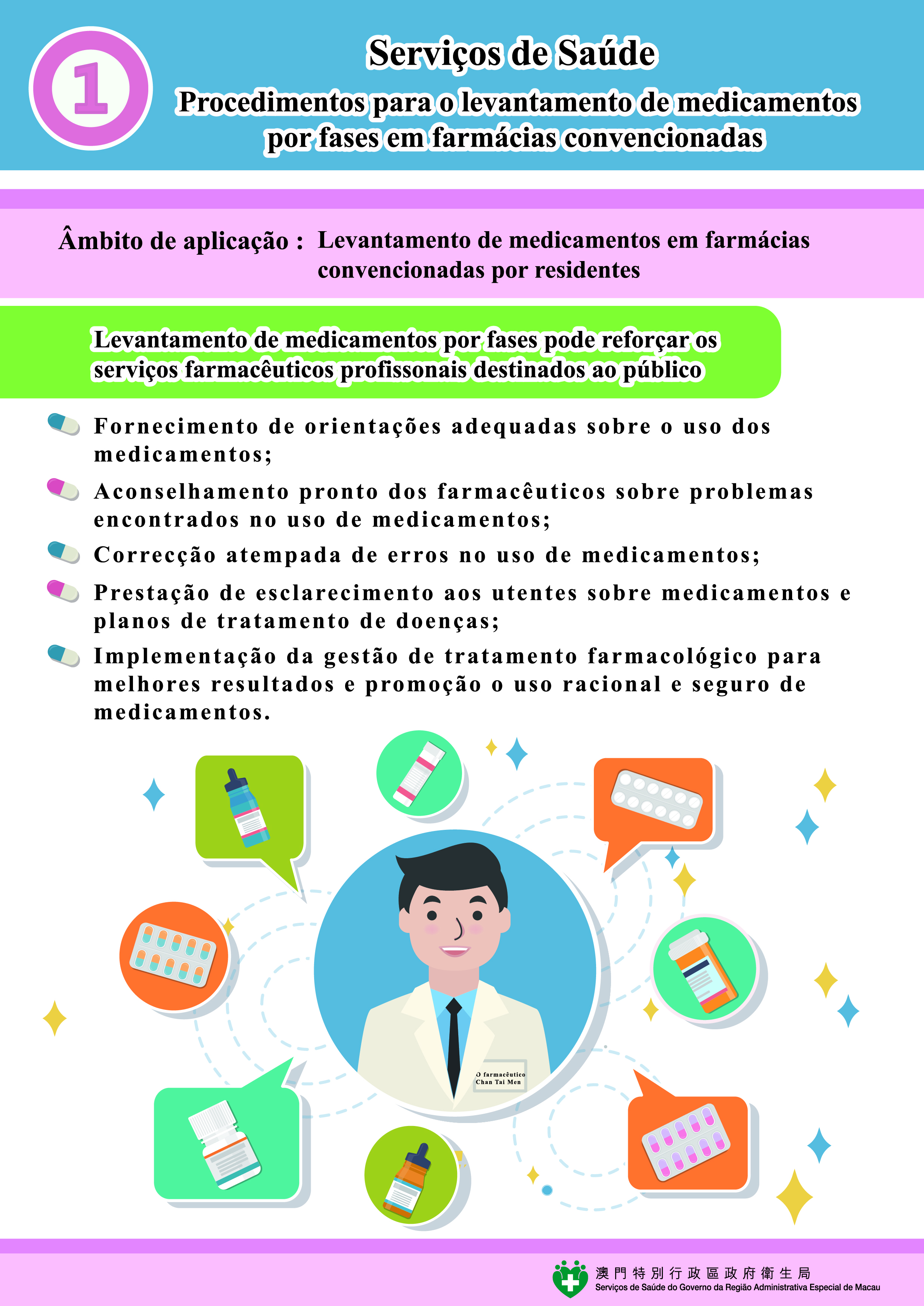 Estas medidas são aplicáveis às pessoas isentas do pagamento de taxas (por exemplo: residentes de Macau com idade igual ou superior a 65 anos) e beneficiários de instituições que tenham protocolos celebrados com os Serviços de Saúde. Para os utentes que pagam os medicamentos por conta própria, os medicamentos podem ser comprados por fases, em qualquer farmácia designada para levantamento dos medicamentos prescritos pelos Serviços de Saúde (também conhecida como farmácias convencionadas). Todos os medicamentos administrados por via oral, são abrangidos nas medidas do levantamento de medicamentos, por fases. Após a prescrição médica ser efectuada, caso a quantidade de medicamentos a administrar por via oral, seja superior a 120 dias, o utente deve dirigir-se às farmácias convencionadas para o levantamento faseado dos medicamentos, e por cada vez só pode levantar quantidades de medicamentos para 90 dias.